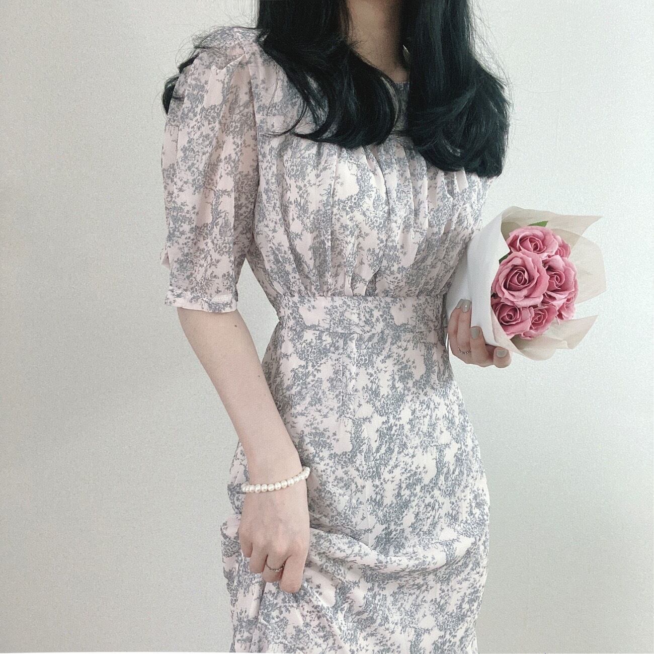 ワンピース シフォンワンピース シフォン ロングスカート ロング丈 レディース 半袖 パフスリーブ ラウンドネック 花柄 ハイウエスト スリム 清楚 上品 フェミニン 大人女子 大人かっこいい お洒落 エレガント 夏 ピンク ブルー 青 ワンサイズ 20代 30代 普段使い 日常使い お出かけ 女子会 休日 大人 コーデ コーディネート 韓国 ファッション オルチャン お取り寄せ 送料無料 hll-0378