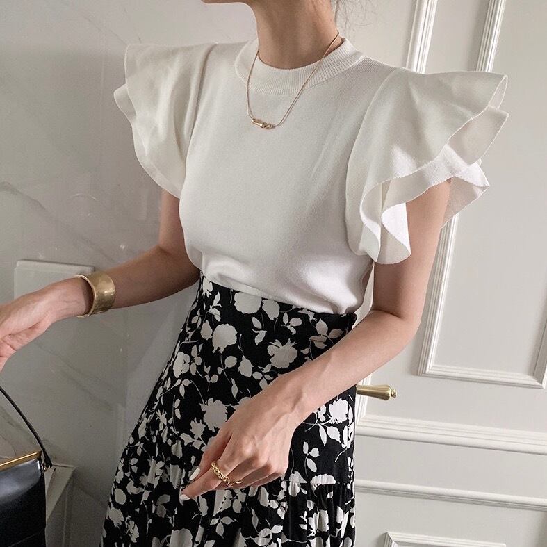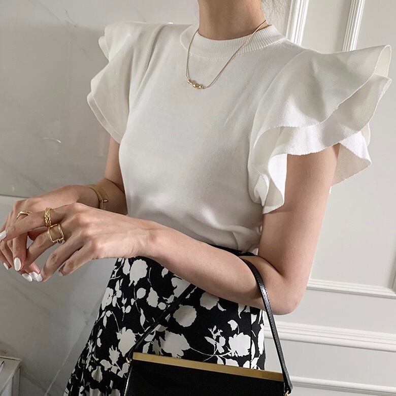 シャツ フリルシャツ レディース トップス 半袖 スクープネック フリル プルオーバー スリム きれいめ 上品 お洒落 デート お出かけ お呼ばれ イベント 女子会 夏 ホワイト 白 ブラック 黒 ワンサイズ 20代 30代 大人 コーデ コーディネート 韓国 ファッション オルチャン お取り寄せ 送料無料 hll-0384
