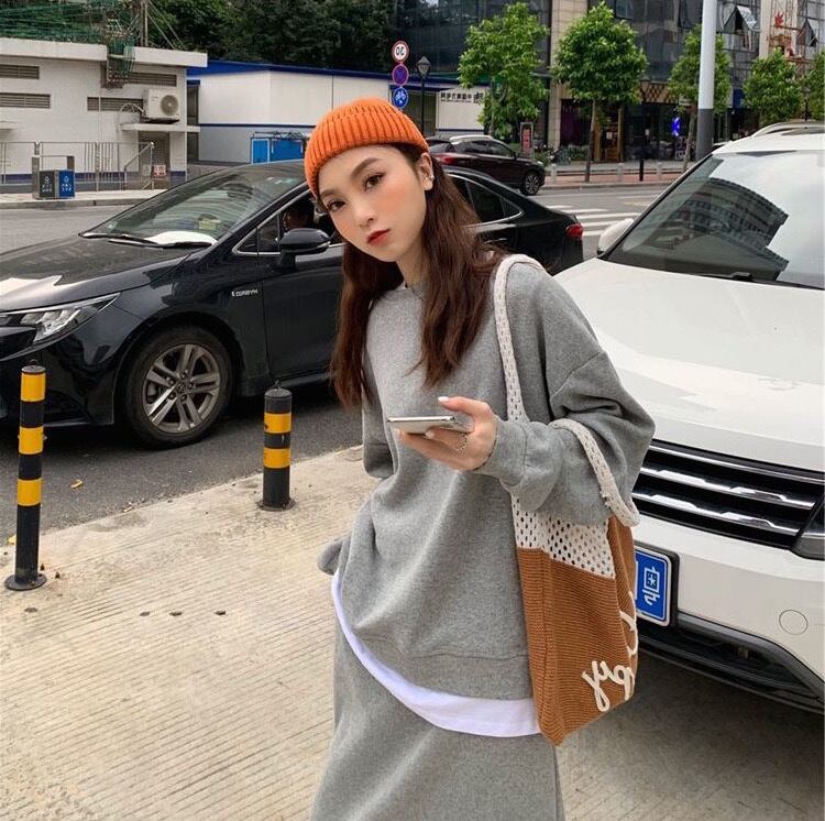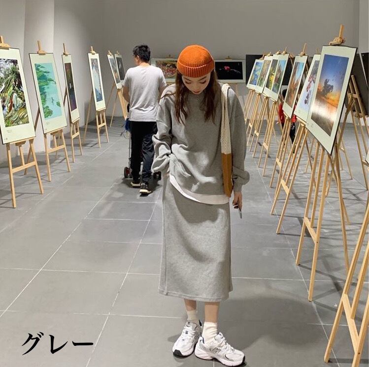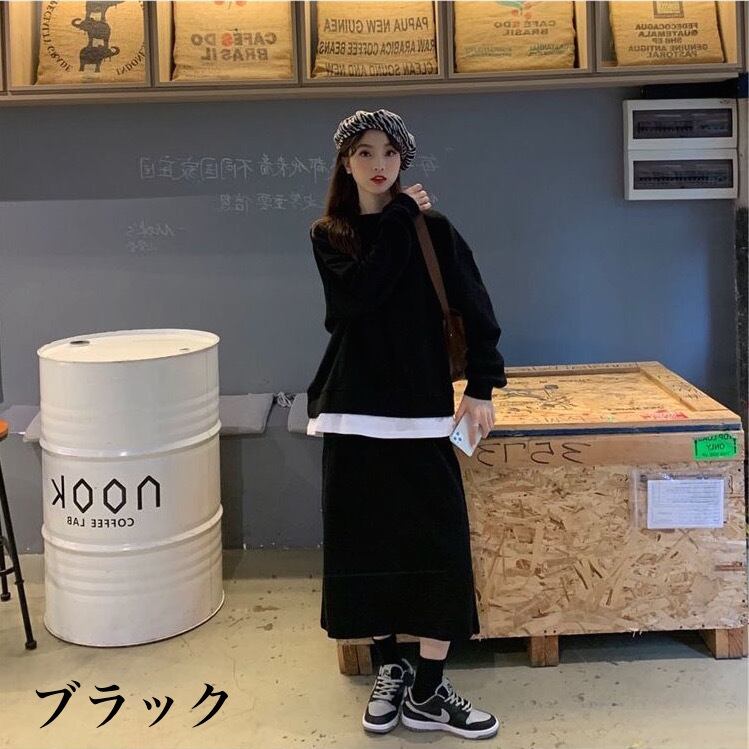 セットアップ スカートスーツ セーター スカート ミドル丈 レディース 長袖 ラウンドネック プルオーバー ハイウエスト 2点セット ルーズ 大人女子 大人かっこいい お洒落 エレガント 春 秋 グレー 灰色 ブラック 黒 20代 30代 L XL 2XL 3XL 4XL ラージサイズ 普段使い 普段着 日常使い 休日 お出かけ デート 女子会 大人 コーデ コーディネート 韓国 ファッション オルチャン お取り寄せ 送料無料 hll-0390