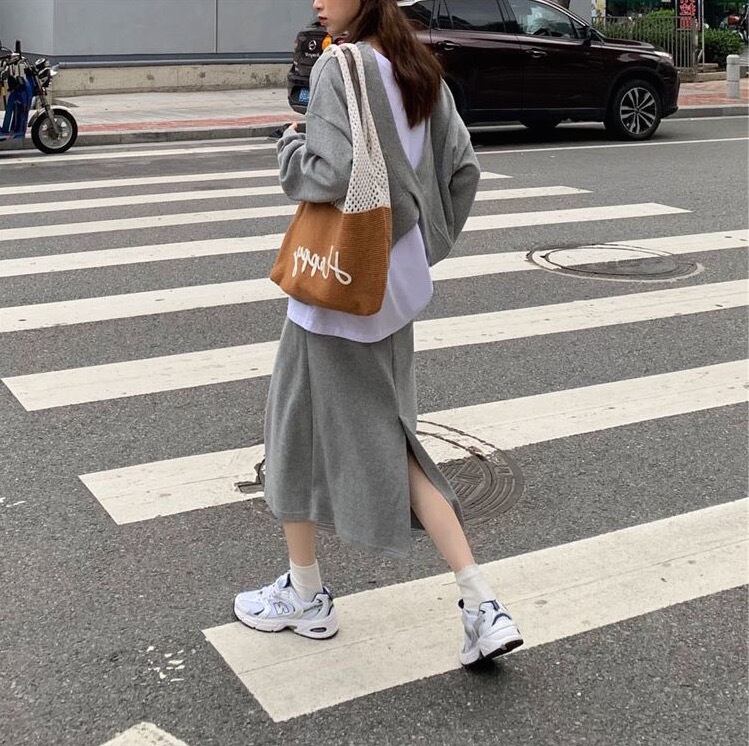 ルーズな長袖セーターとミドル丈のスカートのセットアップです。