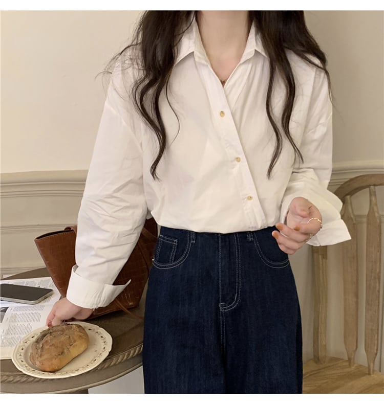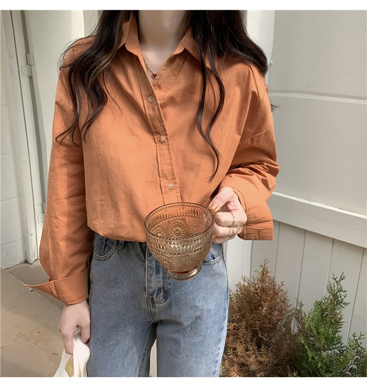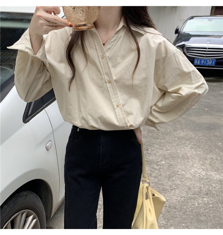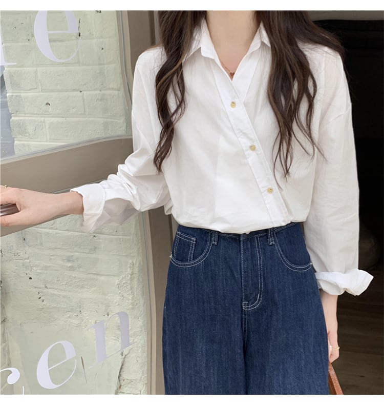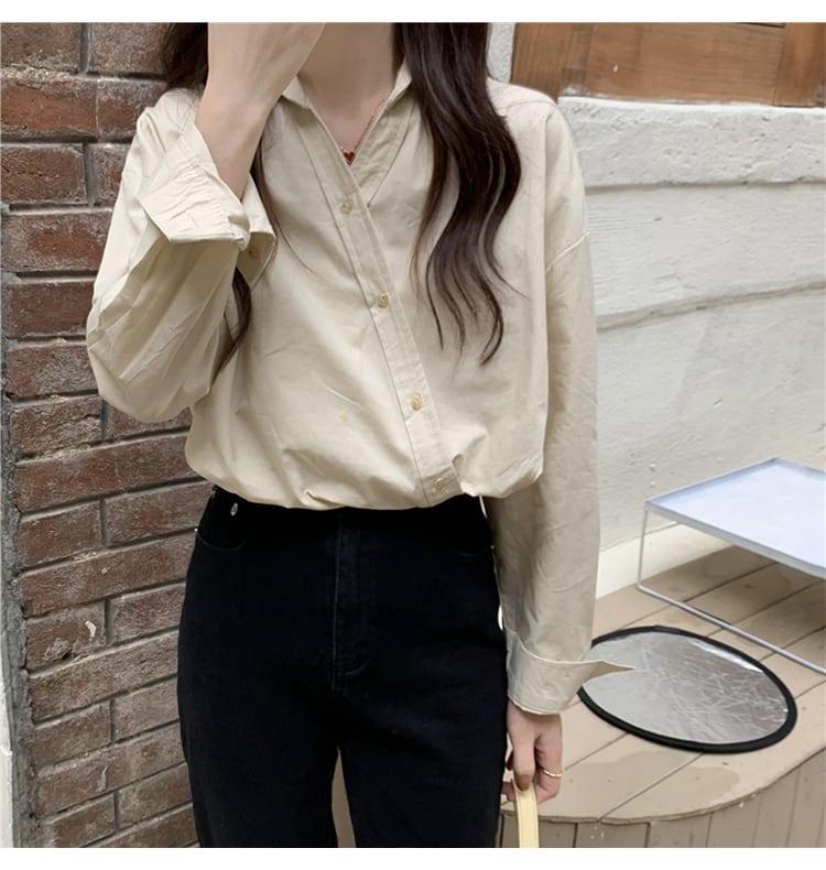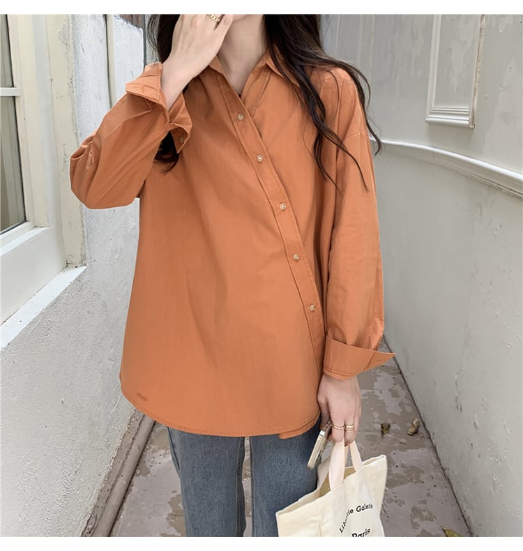 長袖シャツ レディース トップス 長袖 シャツ 斜めボタン ポロカラー 襟付き ロング丈 無地 カジュアル スタイル シンプル 日常 デイリー お出かけ デート 春 秋 10代 20代 30代 女性 大人 コーデ コーディネート 韓国 ファッション オルチャン お取り寄せ 送料無料 hll-0680