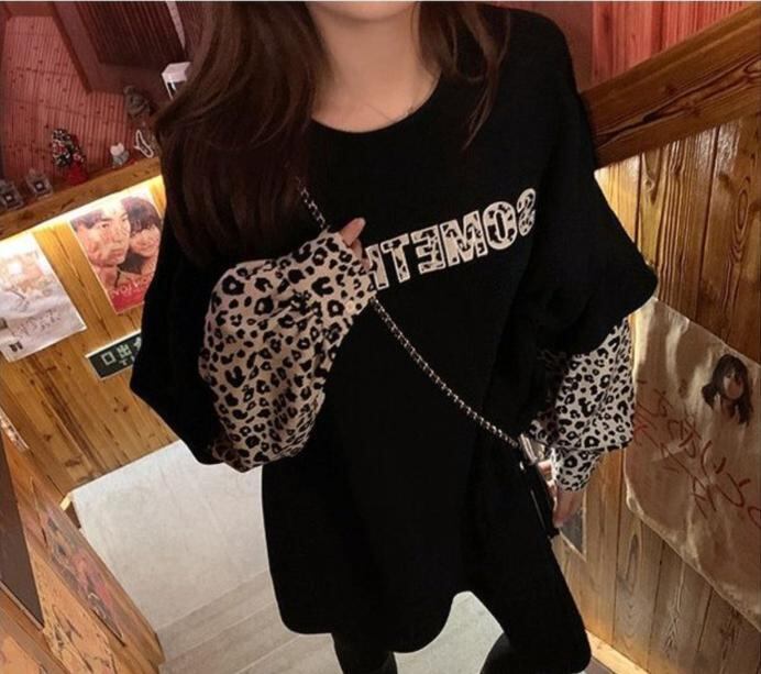 レイヤードカットソー レディース トップス プルオーバー ヒョウ柄 豹柄 長袖 重ね着 ラウンドネック ロゴ オーバーシルエット 体形カバー こなれ感 カジュアル デート お出かけ 春 秋 かわいい 黒 大人 コーデ コーディネート 韓国 ファッション オルチャン お取り寄せ 送料無料 hll-0682