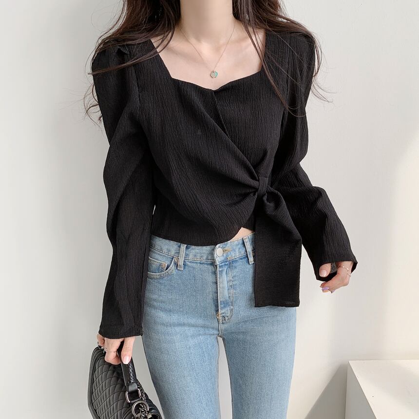 長袖ブラウス レディース トップス ブラウス スクエアネック クロップド クロップド丈 ショート 透け感 おしゃれ リボン こなれ感 デート お出かけ きれいめ 春 秋 白 黒 大人 コーデ コーディネート 韓国 ファッション オルチャン お取り寄せ 送料無料 hll-0683