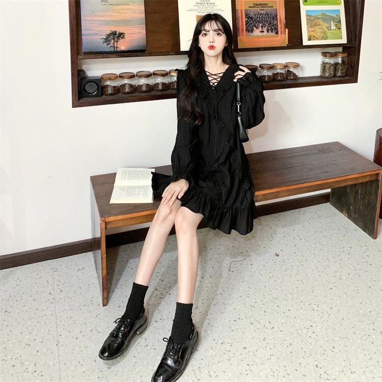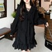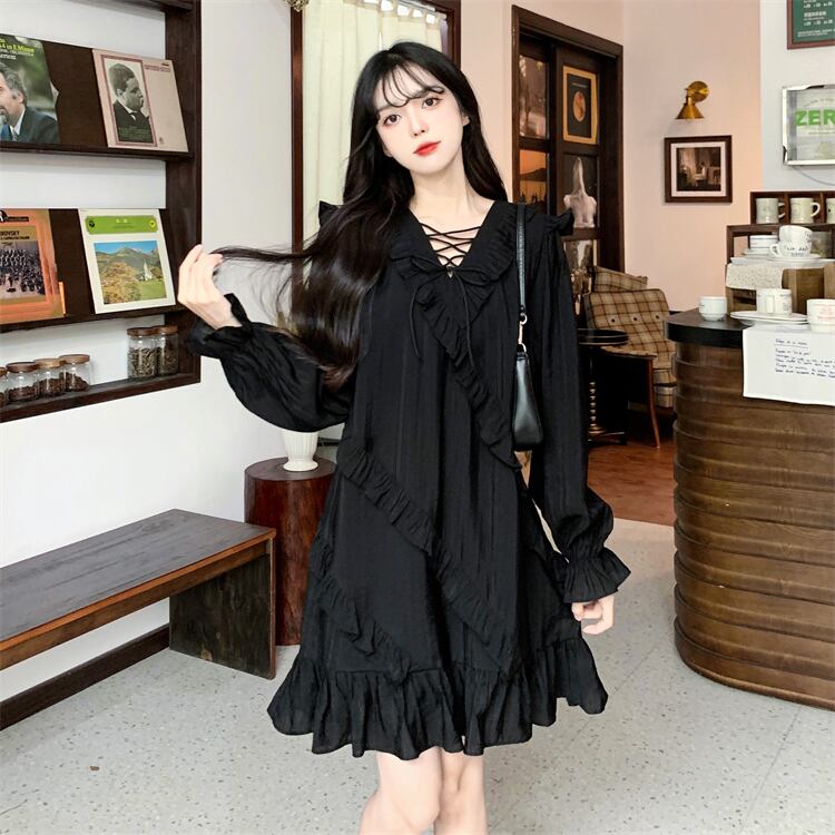 ワンピース レディース 長袖 ティアード ひざ上 Vネック リボン フリル かわいい 可愛い 日常 デート お出かけ 普段着 地雷系女子 4XL 着回し フェミニン ガーリー学生 10代 20代 女子 春 秋 大人 コーデ コーディネート 韓国 ファッション オルチャン お取り寄せ 送料無料 hll-0690