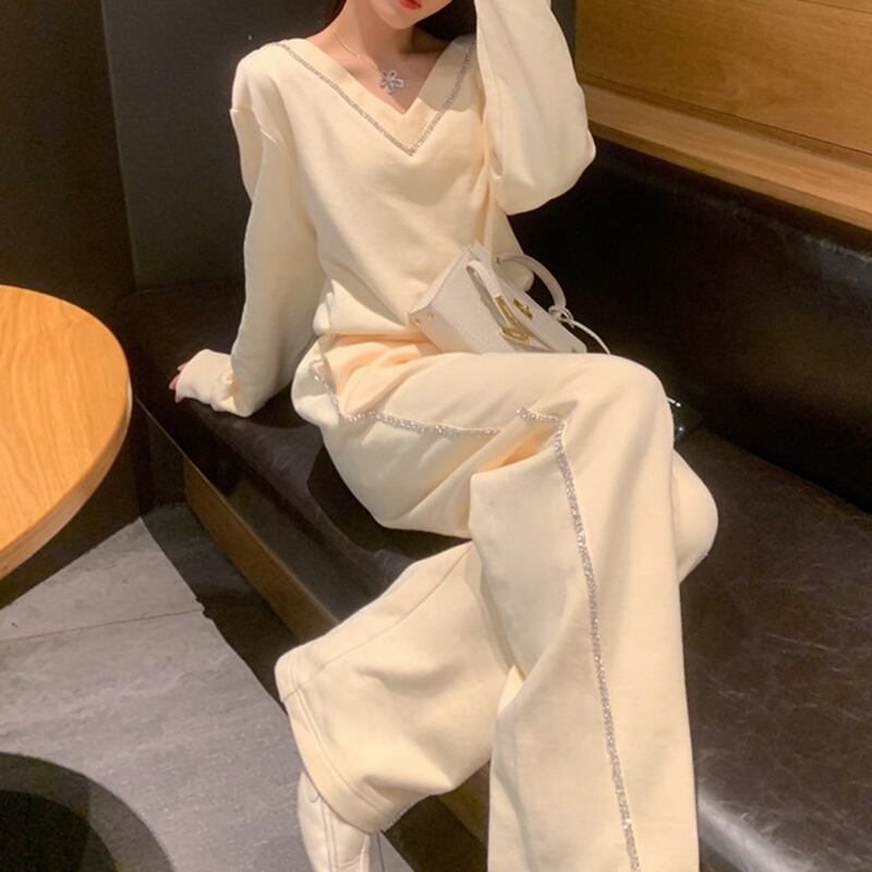 セットアップ レディース トップス ボトムス パンツ 長袖 Vネック シルバー 刺繍 ライン ショート丈 スウェット カジュアル ストリート系 かわいい 可愛い 日常 デート お出かけ 普段着 10代 20代 白 大人 コーデ コーディネート 韓国 ファッション オルチャン お取り寄せ 送料無料 hll-0695