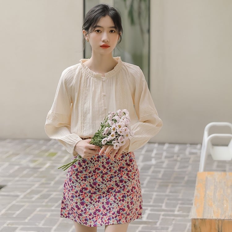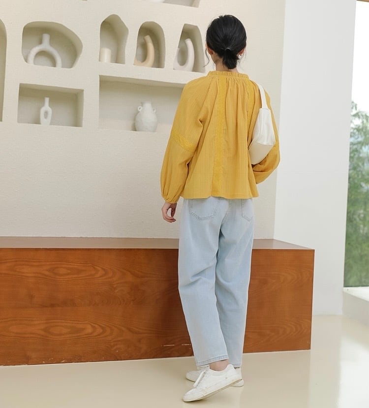 シャツ ブラウス レディース トップス 長袖 ランタンスリーブ スタンドカラー ボタン 前開き 無地 レトロ カジュアル フェミニン きれいめ 上品 清楚 お洒落 普段使い 普段着 日常使い お出かけ デート 女子会 休日 春 アプリコット イエロー 黄色 S M L 10代 20代 大人 大人かっこいい コーデ コーディネート 韓国 ファッション オルチャン お取り寄せ 送料無料 hll-0445