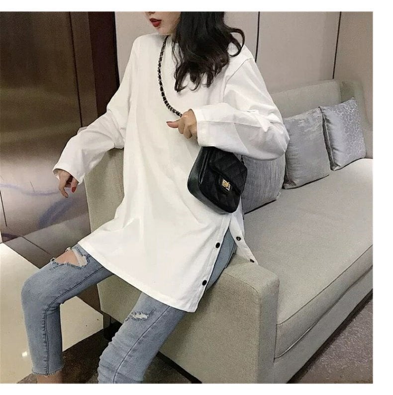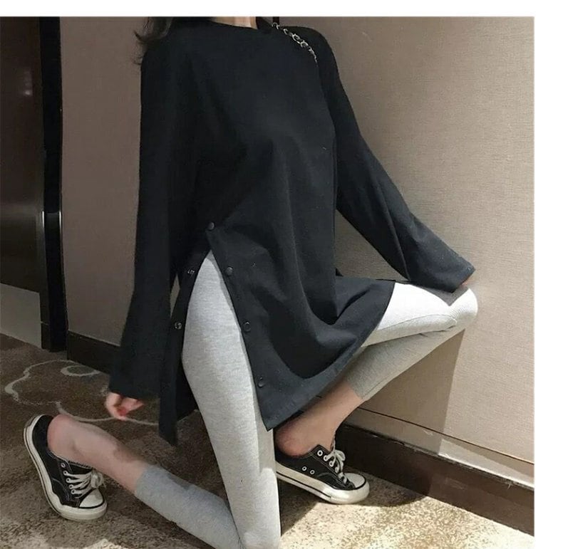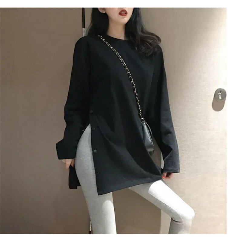 長袖カットソー レディース トップス 長袖 カットソー ラウンドネック サイドスリット ボタン チュニック丈 ゆる シンプル かわいい 可愛い 日常 デート お出かけ 普段着 10代 20代 無地 春 薄手 黒 白 大人 コーデ コーディネート 韓国 ファッション オルチャン お取り寄せ 送料無料 hll-0706