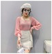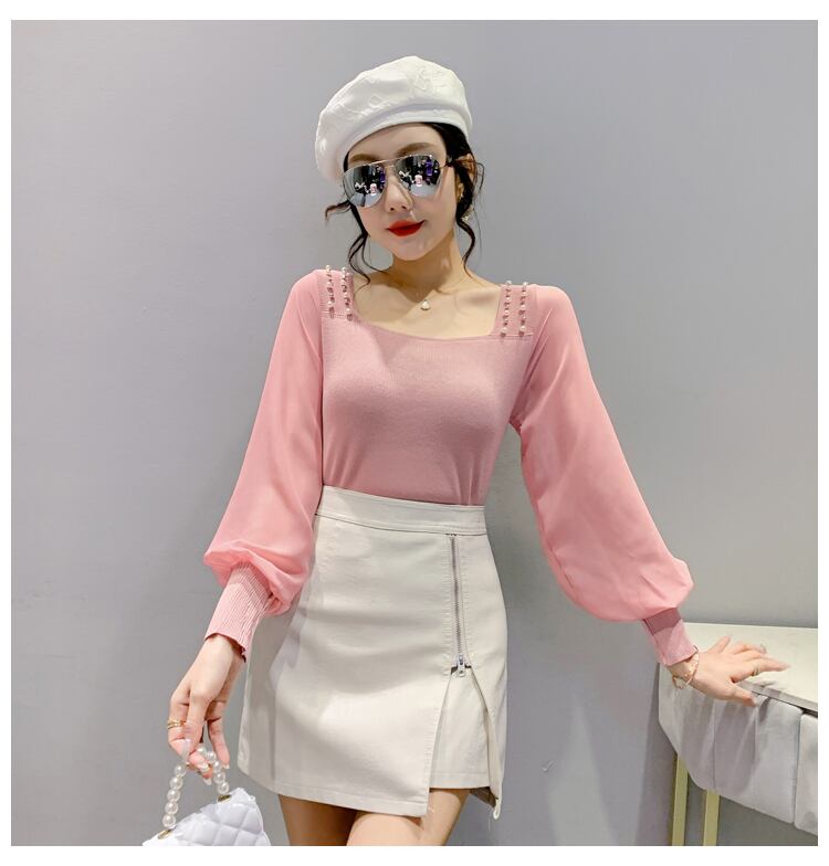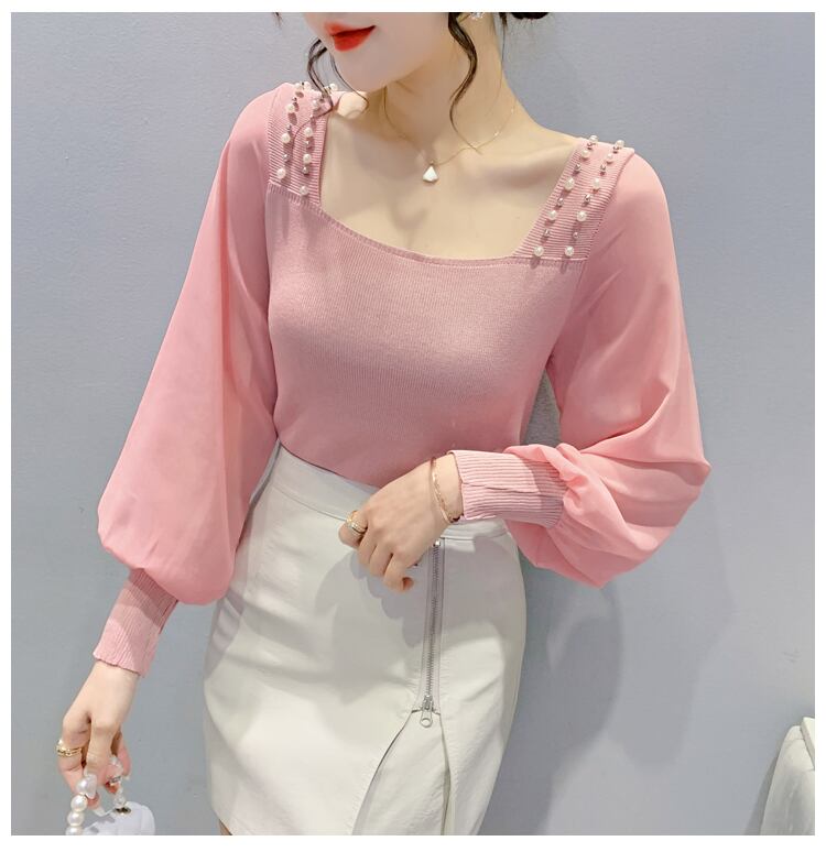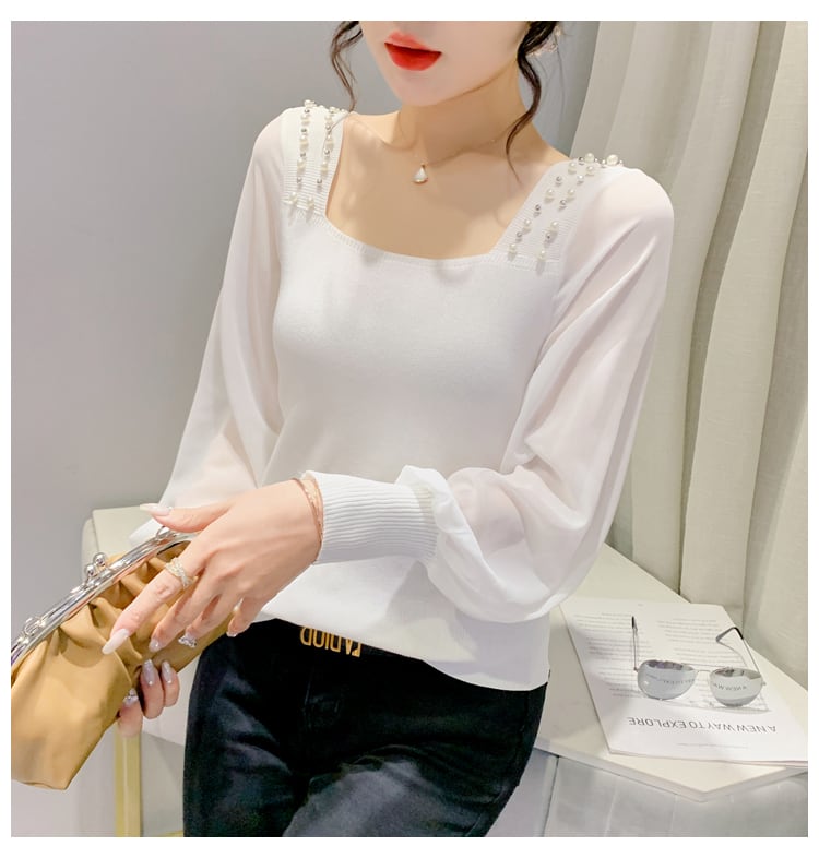 長袖カットソー レディース トップス ニット 長袖 カットソー スクエアネック 透け感 ボリューム袖 パール デコルテ 異素材ミックス 春 夏 きれいめ 上品 お出かけ 着回し デート フェミニン 仕事 白 黒 大人 コーデ コーディネート 韓国 ファッション オルチャン お取り寄せ 送料無料 hll-0715