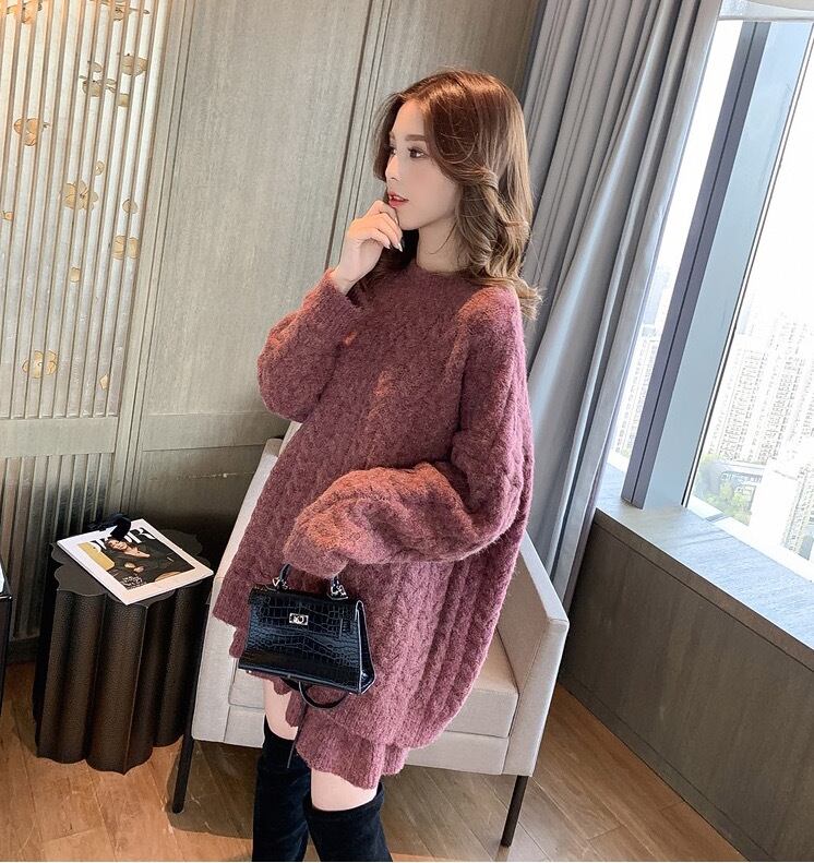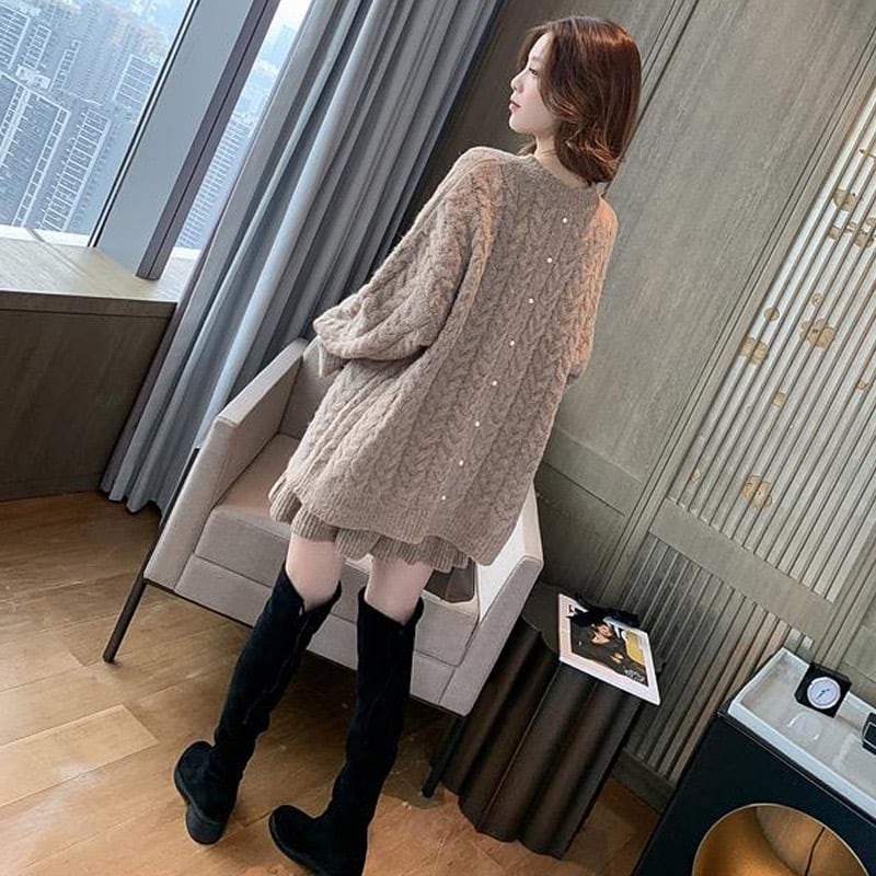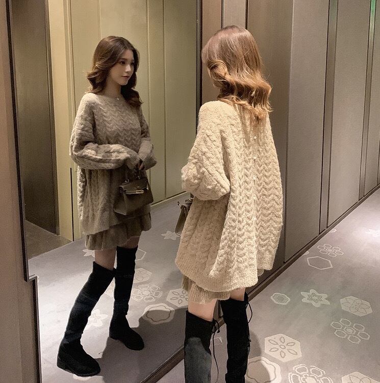 だぼっとしたルーズな長袖セーターとショート丈のスカートのセットアップです。