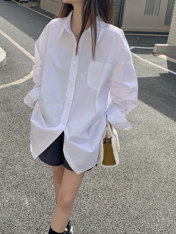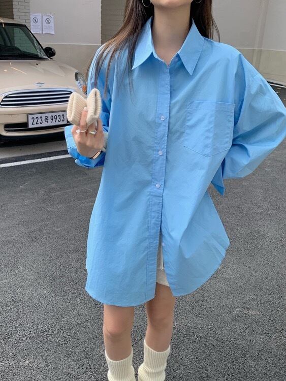 シャツ ブラウス ミドル丈 レディース トップス 長袖 襟付き ポロカラー ボタン 前開き 無地 シンプル ルーズ レトロ カジュアル きれいめ 上品 清楚 お洒落 普段使い 普段着 日常使い お出かけ デート 女子会 休日 春 ホワイト 白 ブルー 青 ワンサイズ 10代 20代 30代 大人 大人かっこいい コーデ コーディネート 韓国 ファッション オルチャン お取り寄せ 送料無料 hll-0477