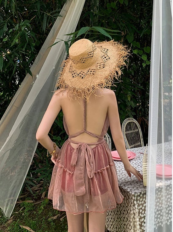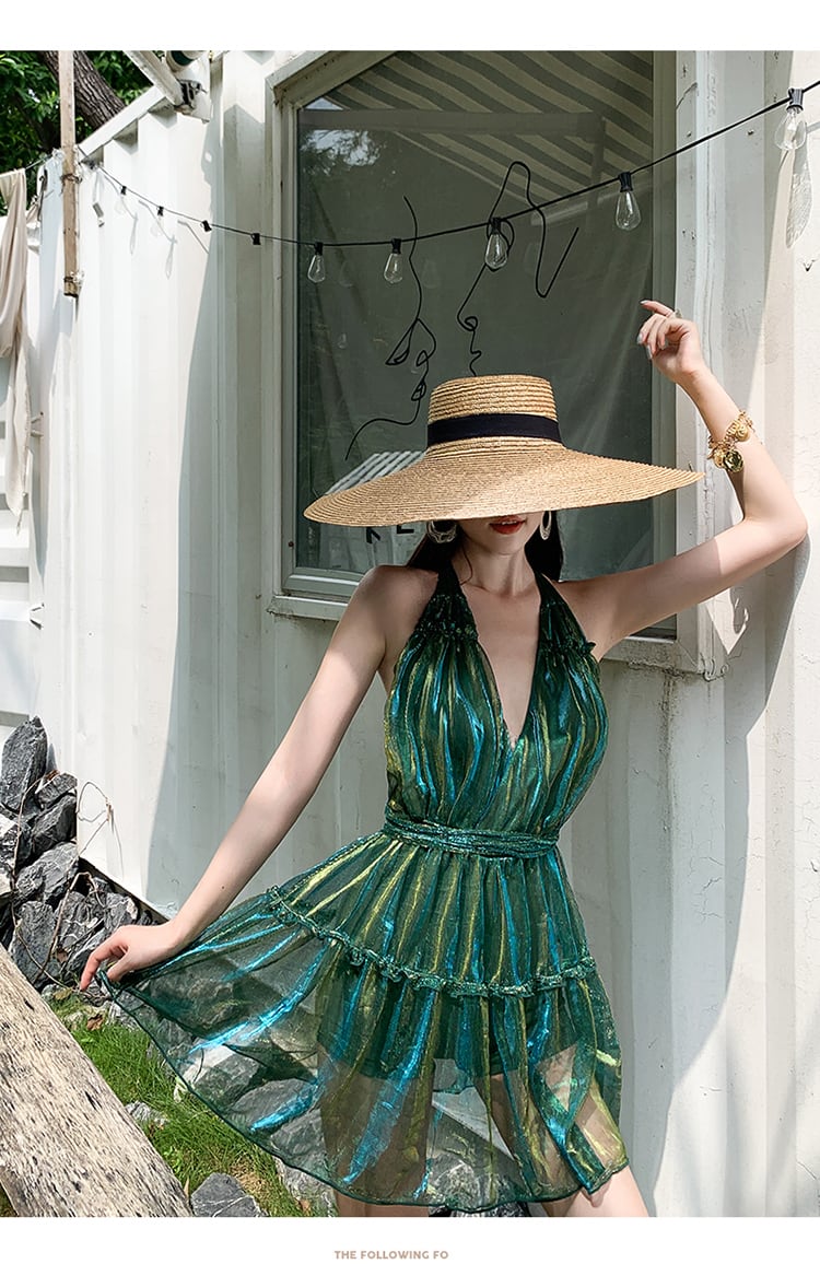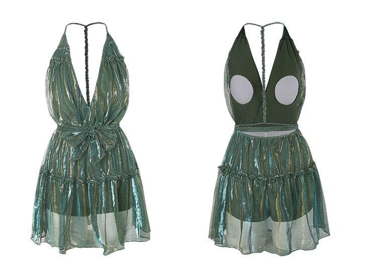 ワンピース水着 レディース ワンピース 水着 フレア ミニ バックコンシャス ホルターネック セクシー ビーチ リゾート 海 プール 夏 ピンク 緑 かわいい フェミニン ガーリー 光沢感 10代 20代 女性 大人 コーデ コーディネート 韓国 ファッション オルチャン お取り寄せ 送料無料 hll-0775