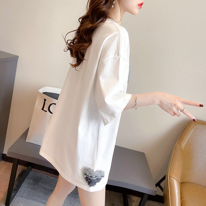 Tシャツ レディース トップス 半袖 オーバーサイズ ラウンドネック ハート 薄手 体形カバー 春 夏 オーバーシルエット ゆる 楽ちん かわいい フェミニン ガーリー 白 黒 10代 20代 女性 通勤 通学 学生 大人 コーデ コーディネート 韓国 ファッション オルチャン お取り寄せ 送料無料 hll-0784