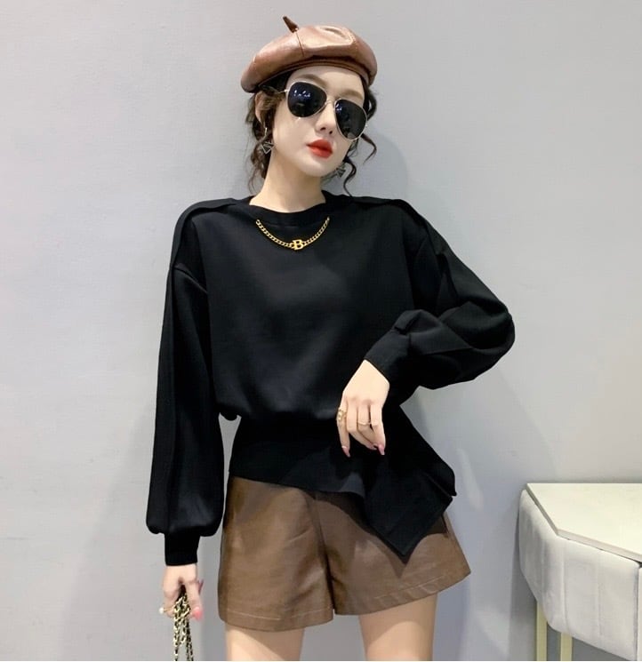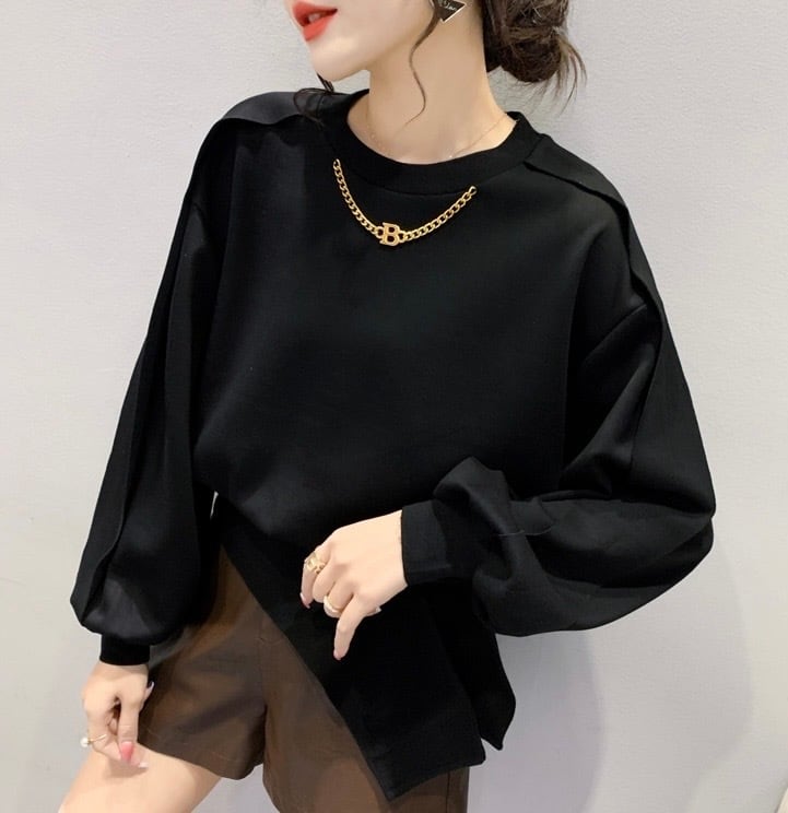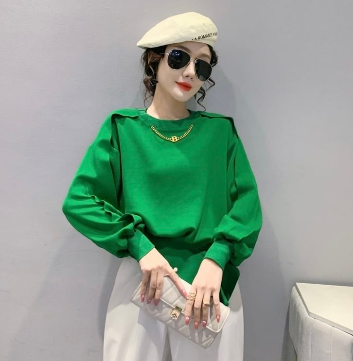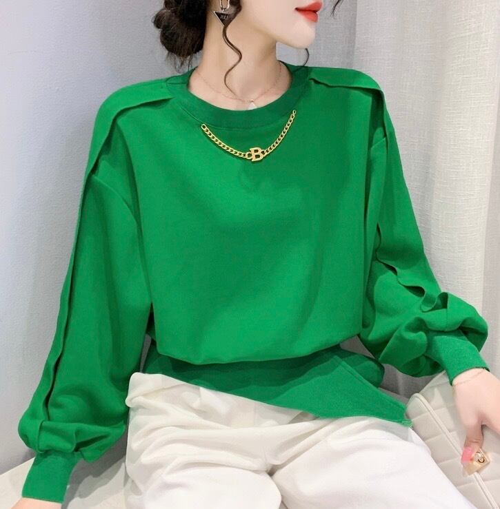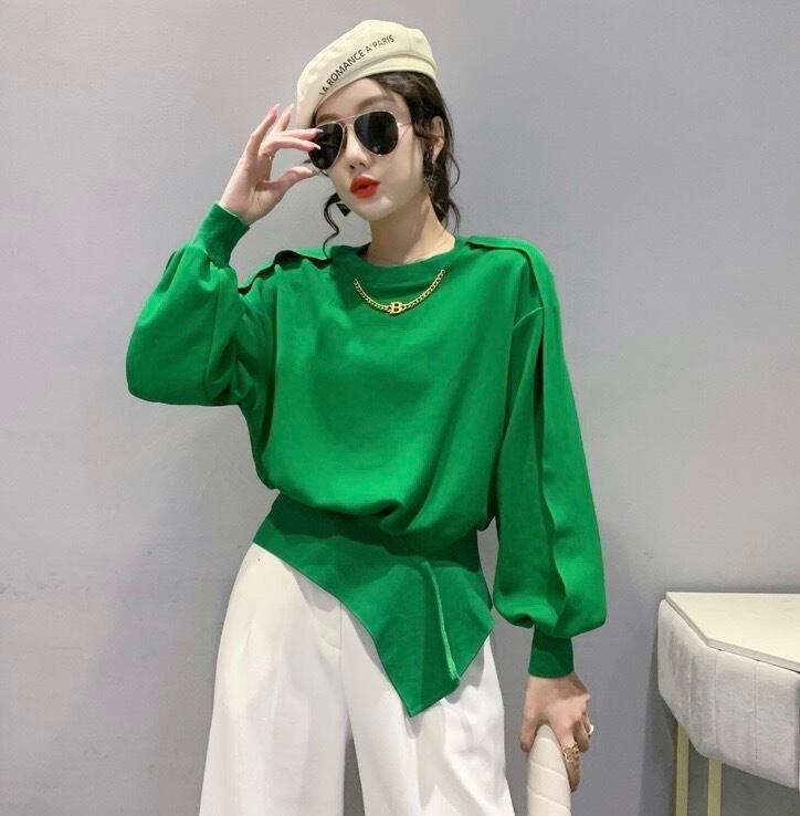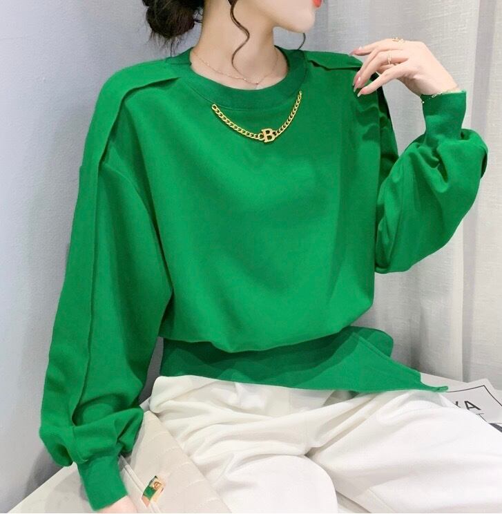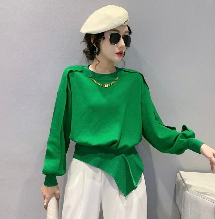 アシンメトリープルオーバー レディース トップス 長袖 ラウンドネック チェーン 無地 プルオーバー ルーズ レトロ カジュアル きれいめ 上品 清楚 お洒落 OL 通勤 普段使い 普段着 日常使い お出かけ デート 女子会 春 秋 グリーン 緑 ブラック 黒 S M L XL 2XL 3XL ラージサイズ 20代 30代 大人 大人かっこいい コーデ コーディネート 韓国 ファッション オルチャン お取り寄せ 送料無料 hll-0726