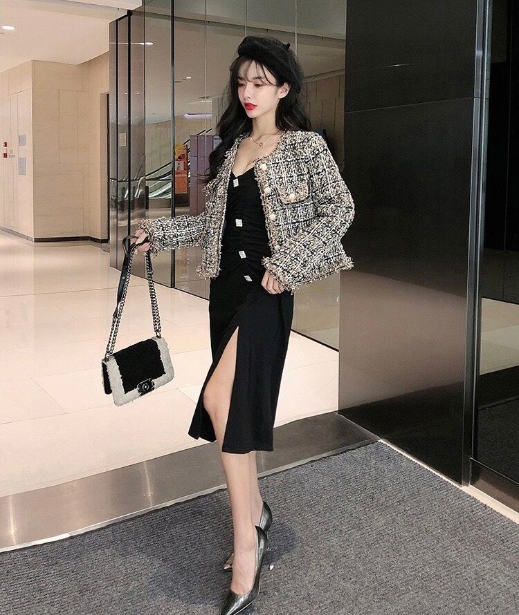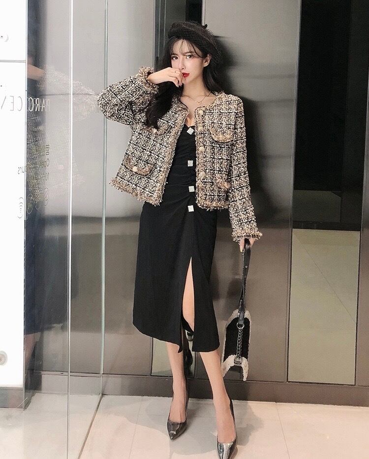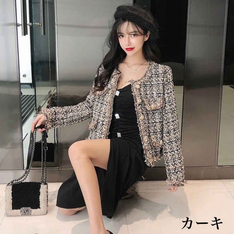 ジャケット ショートジャケット ショート丈 アウター レディース 長袖 ラウンドネック ボタン 前開き ツイード スリム カジュアル レトロ きれいめ お洒落 普段使い 普段着 日常使い OL 通勤 お出かけ デート 女子会 秋 冬 カーキ ブラック 黒 S M L 20代 30代 40代 大人 大人かっこいい コーデ コーディネート 韓国 ファッション オルチャン お取り寄せ 送料無料 hll-0740