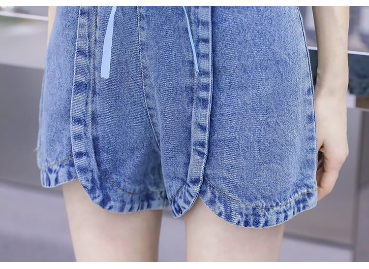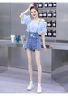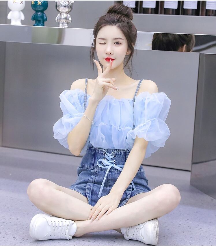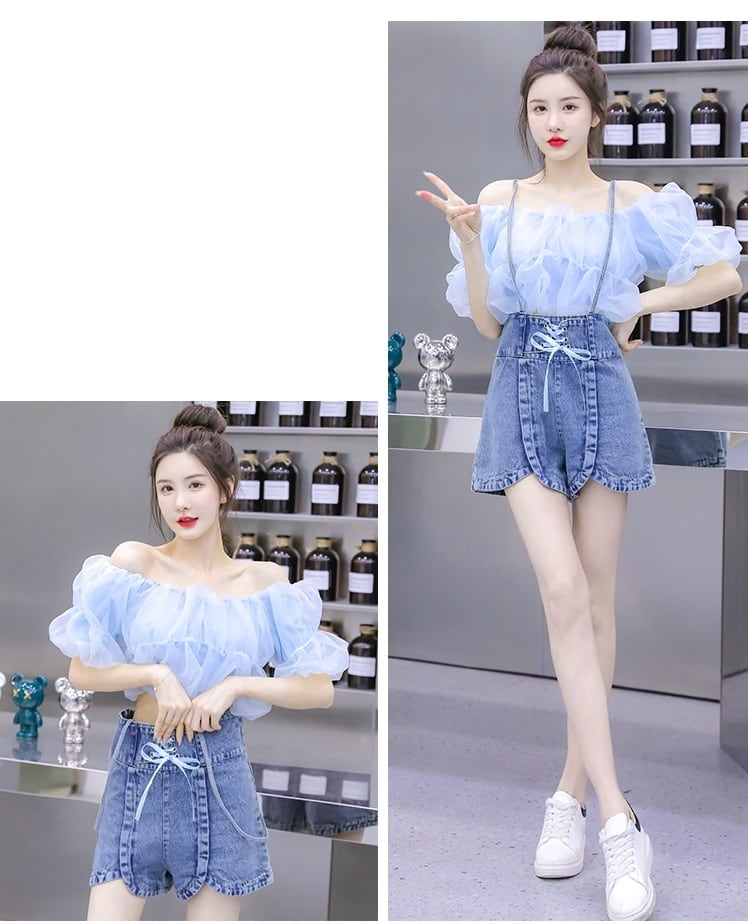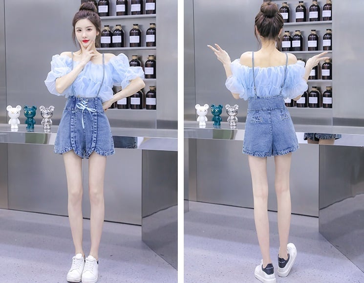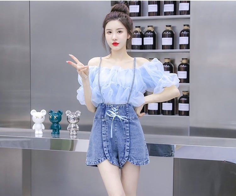 セットアップ レディース トップス デニム オーバーオール 半袖 オフショルダー ツーピース ク ロップド丈 ミニ ハイウエスト 編み上げ ショートパンツ 夏 10代 20代 女子 かわいい 可愛い 日常 デート お出かけ フェミニン 青 大人 コーデ コーディネート 韓国 ファッション オルチャン お取り寄せ 送料無料 hll-0786