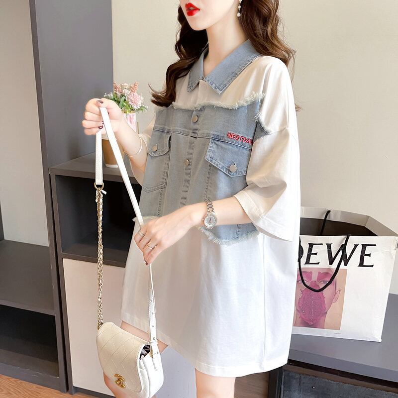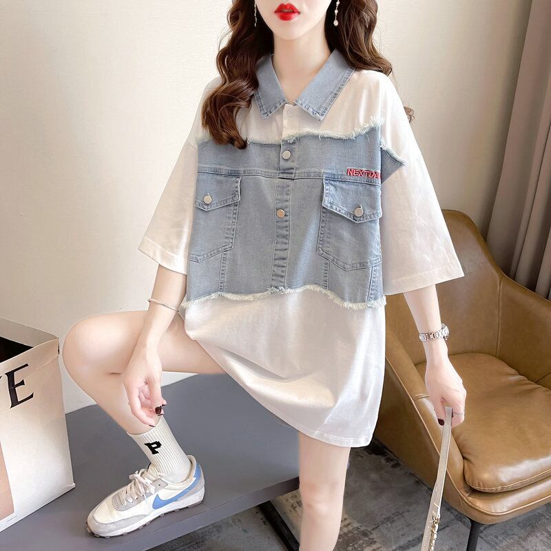 オーバーサイズTシャツ レディース トップス Tシャツ デニム 半袖 プルオーバー オーバーサイズ 異素材ミックス 襟付き ドロップショルダー ロング丈 黒 白 カジュアル シンプル ストリート系 アメカジ デニム加工 通学 学生 休日 10代 20代 女子 春 夏 大人 コーデ コーディネート 韓国 ファッション オルチャン お取り寄せ 送料無料 hll-0788