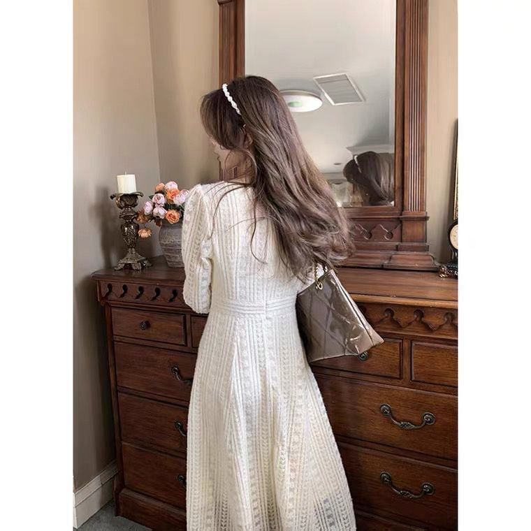 ミドル丈ワンピース レディース ワンピース ミドル丈 スクエアネック 透け感 ニット ハイウエスト プルオーバー オフホワイト フェミニン ガーリー かわいい 清楚系 秋 冬 10代 20代 女子 大人 コーデ コーディネート 韓国 ファッション オルチャン お取り寄せ 送料無料 hll-0797