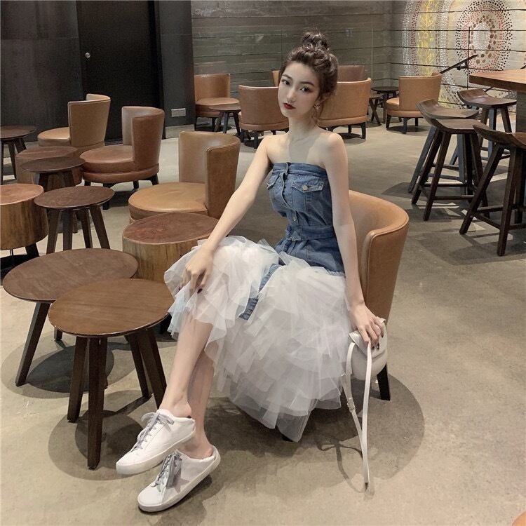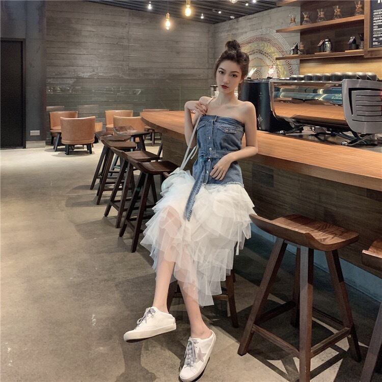 セットアップ チューブトップ デニム スカート ロングスカート メッシュスカート フリルスカート ロング丈 2点セット 上下セット レディース ノースリーブ ハイウエスト スリム カジュアル 大人女子 大人かっこいい お洒落 可愛い 夏 ブルー 青 ホワイト 白 10代 20代 S M L 普段使い 日常使い お出かけ デート レジャー 女子会 大人 コーデ コーディネート 韓国 ファッション オルチャン お取り寄せ 送料無料 hll-0760