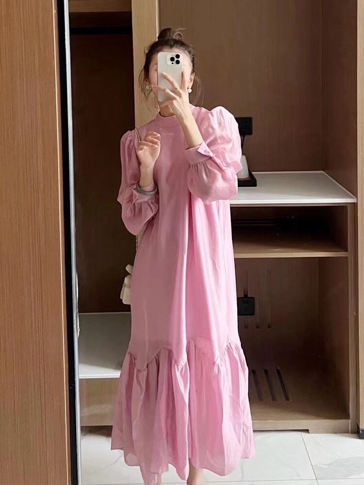 ワンピース ロング丈ワンピース Aラインスカート Aライン ロング丈 レディース 長袖 パフスリーブ 無地 シンプル プルオーバー ハイウエスト ルーズ 清楚 上品 フェミニン 大人女子 大人かっこいい お洒落 エレガント 春 秋 ピンク S M L XL 10代 20代 普段使い 日常使い お出かけ 女子会 休日 大人 コーデ コーディネート 韓国 ファッション オルチャン お取り寄せ 送料無料 hll-0770