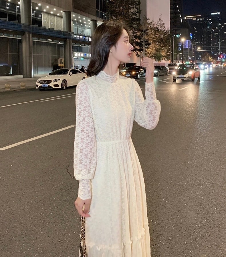 ワンピース ロング丈ワンピース レースワンピース Aラインスカート Aライン ロング丈 レース レディース 長袖 スタンドカラー プルオーバー ハイウエスト スリム 清楚 上品 フェミニン 大人女子 大人かっこいい お洒落 エレガント 秋 冬 アプリコット S M L XL 2XL 10代 20代 普段使い 日常使い お出かけ デート 女子会 休日 大人 コーデ コーディネート 韓国 ファッション オルチャン お取り寄せ 送料無料 hll-0801