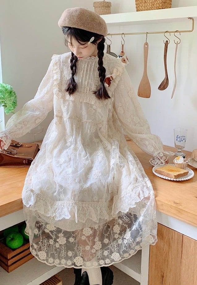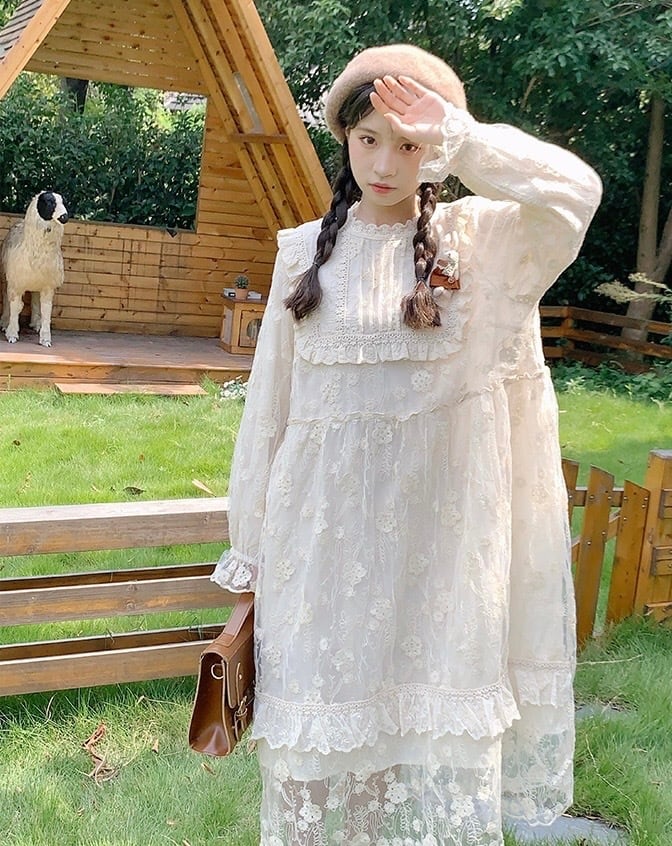 ワンピース ロング丈ワンピース レースワンピース Aラインスカート Aライン ロング丈 レース フリル 透け感 レディース 長袖 ラウンドネック プルオーバー ルーズウエスト ルーズ 清楚 上品 フェミニン 大人女子 大人かっこいい お洒落 エレガント 春 ホワイト 白 ワンサイズ 10代 20代 普段使い 日常使い お出かけ デート 女子会 休日 大人 コーデ コーディネート 韓国 ファッション オルチャン お取り寄せ 送料無料 hll-0805