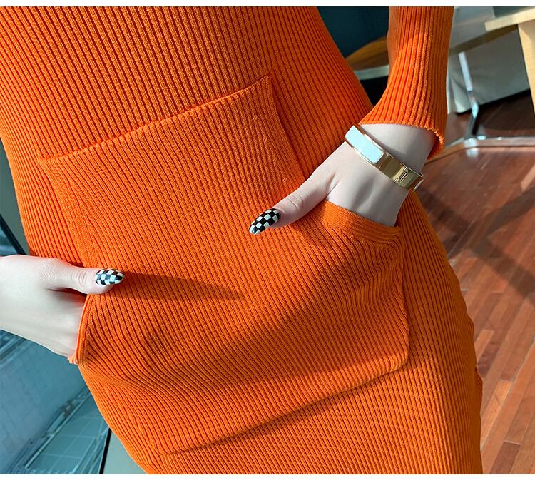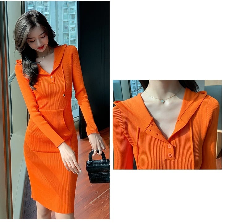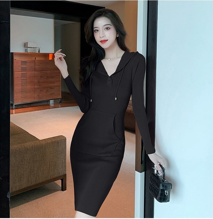 タイトワンピース レディース ワンピース ワンピ ミドル丈 長袖 フード付き ポケット タイト リブ ニット きれいめ 上品 デート 普段使い おしゃれ 人気 ルームウェア 黒 10代 20代 女子 大人 コーデ コーディネート 韓国 ファッション オルチャン お取り寄せ 送料無料 hll-0860