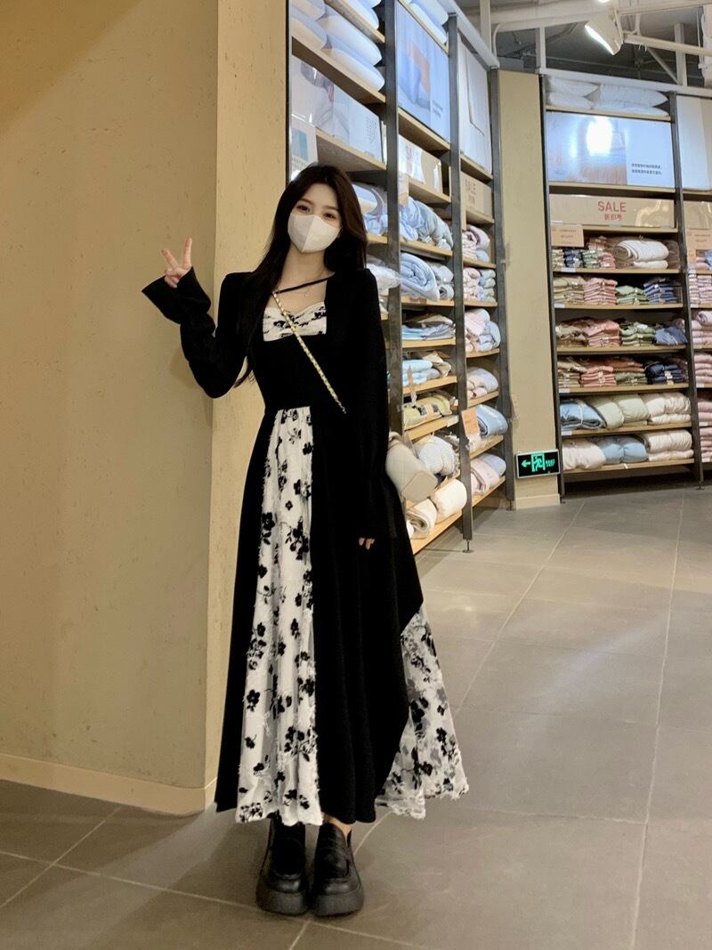 ブラックの花柄のプリントがお洒落な長袖ロング丈ワンピースです。