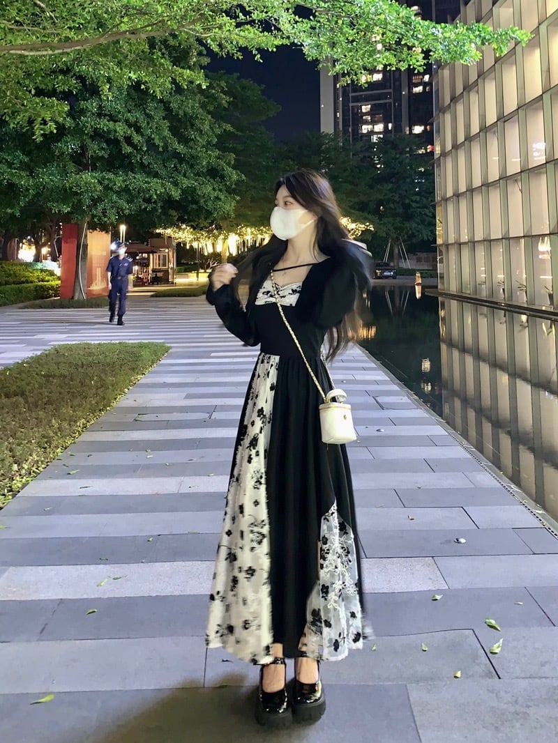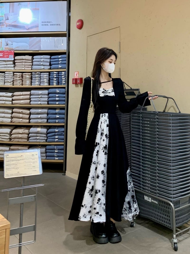 ワンピース ロング丈ワンピース 花柄ワンピース 花柄 ロング丈 レディース 長袖 パフスリーブ スクエアカラー ジッパー ファスナー ハイウエスト スリム シック 清楚 上品 大人女子 大人かっこいい お洒落 エレガント 秋 冬 ブラック 黒 M L XL 2XL 3XL 4XL ラージサイズ 大きいサイズ 10代 20代 30代 お出かけ デート 女子会 お呼ばれ 大人 コーデ コーディネート 韓国 ファッション オルチャン お取り寄せ 送料無料 hll-0808