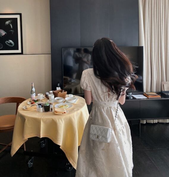 ワンピース ロングスカート ロング丈ワンピース Aラインスカート Aライン レディース 半袖 パフスリーブ Vネック ハイウエスト カジュアル レトロ 上品 清楚 エレガント 大人可愛い お洒落 大人 夏 シャンパン S M L XL 普段着 普段使い 日常使い お出かけ デート 女子会 休日 コーデ コーディネート オルチャン 韓国 ファッション お取り寄せ 送料無料 hll-0818