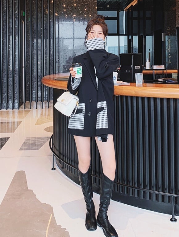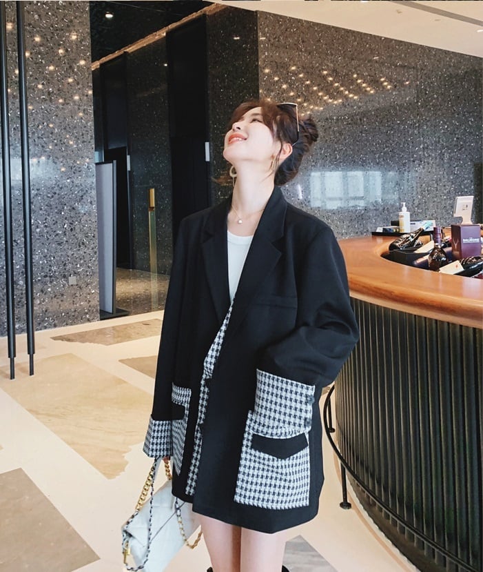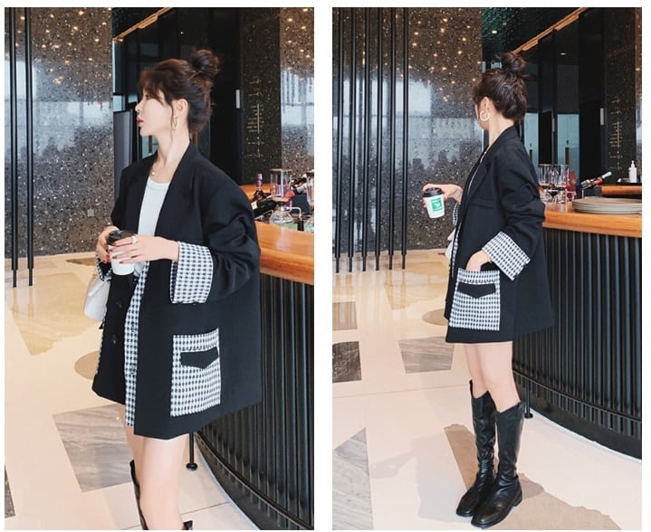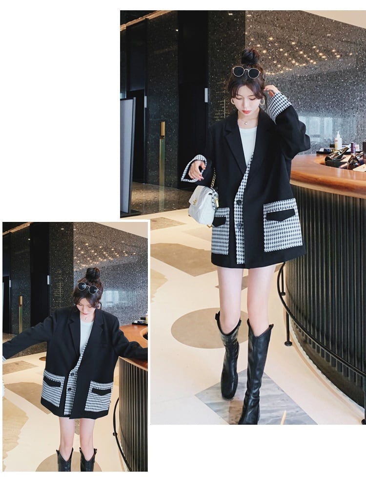 ジャケット レディース アウター オーバーサイズ 千鳥格子 襟付き ポケット 長袖 きれいめ 上品 エレガント カジュアル 黒 仕事 オフィス 普段使い デート お出かけ 通勤 20代 30代 女性 春 秋 大人 コーデ コーディネート 韓国 ファッション オルチャン お取り寄せ 送料無料 hll-0868