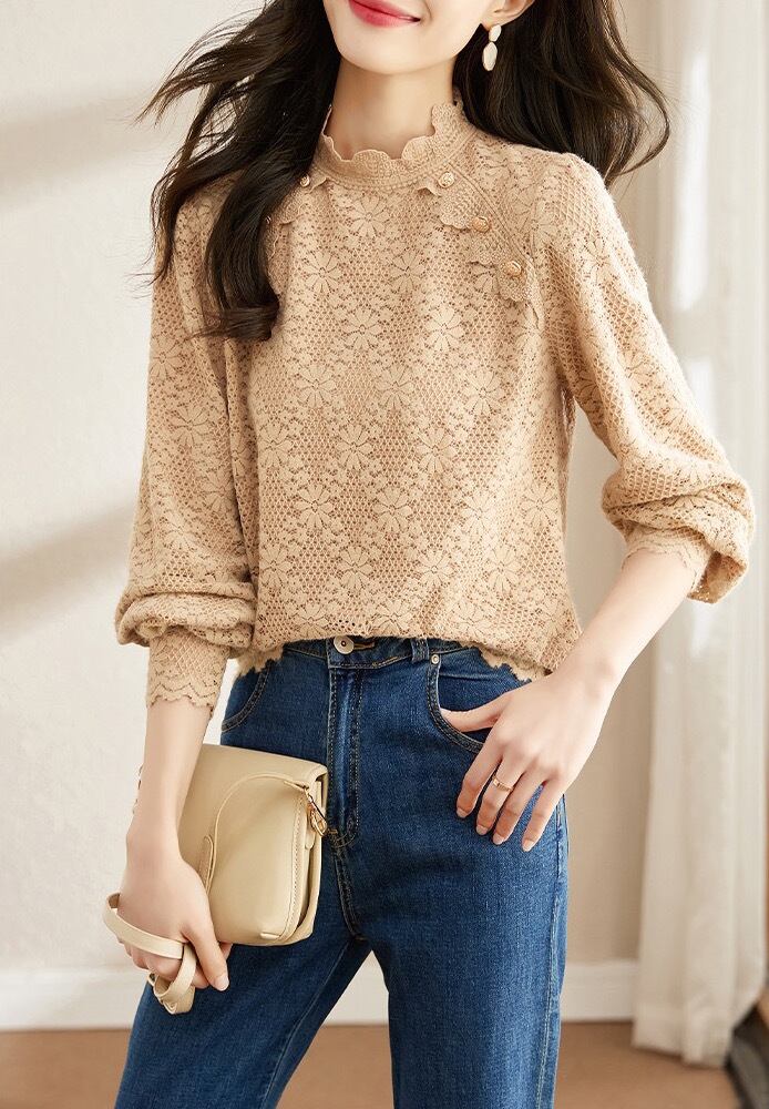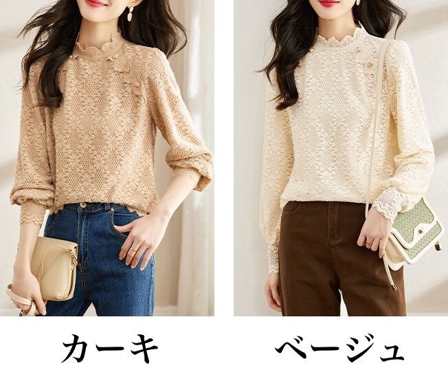 シャツ シフォンシャツ レースシャツ シフォン レース レディース トップス 長袖 パフスリーブ ハイカラー プルオーバー ルーズ シック レトロ カジュアル きれいめ 上品 清楚 お洒落 お出かけ デート 女子会 普段使い 日常使い 普段着 休日 春 秋 ベージュ カーキ S M L XL 2XL 3XL ラージサイズ 20代 30代 大人 大人かっこいい コーデ コーディネート 韓国 ファッション オルチャン お取り寄せ 送料無料 hll-0832