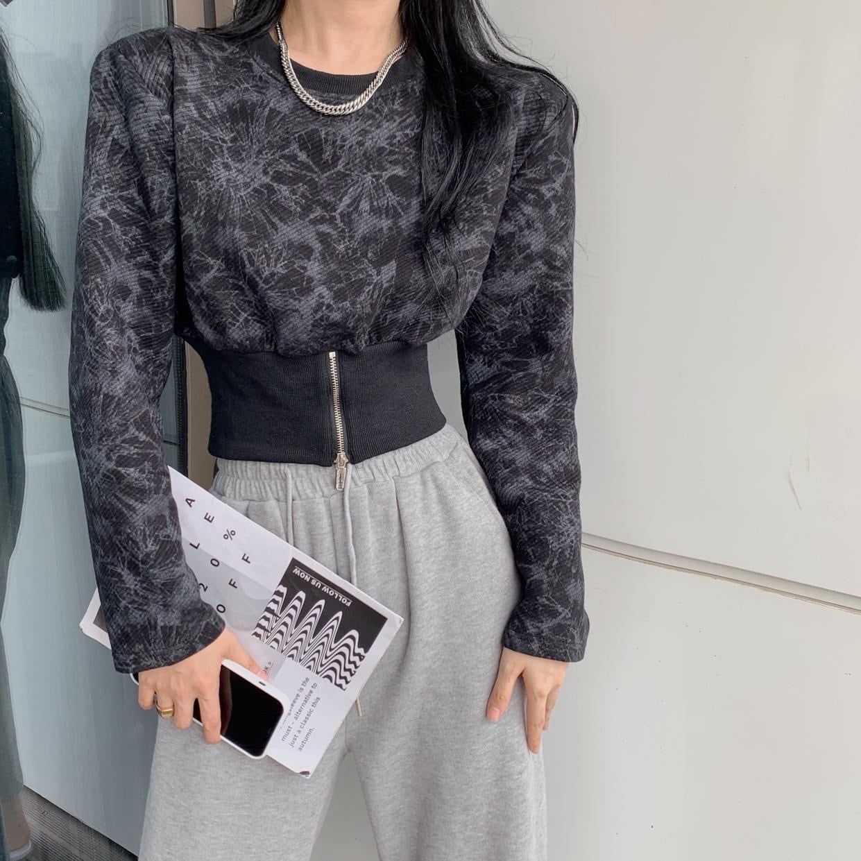 セーター ショート丈 レディース トップス 長袖 ラウンドネック ジッパー ファスナー プルオーバー タイダイ柄 スリム レトロ カジュアル きれいめ 上品 清楚 お洒落 普段使い 普段着 日常使い お出かけ デート 女子会 秋 冬 グレー 灰色 ブラック 黒 S M L 20代 30代 大人 大人かっこいい コーデ コーディネート 韓国 ファッション オルチャン お取り寄せ 送料無料 hll-0845