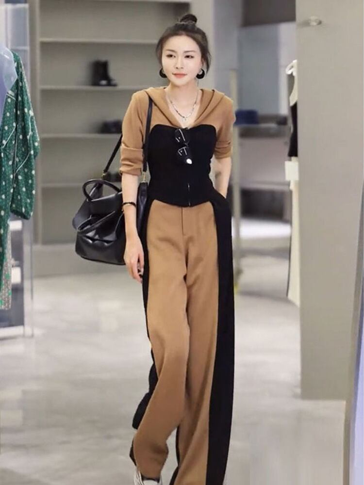 セットアップ レディース パンツスーツ ワイドレッグパンツ パンツ パーカー フード付き 2点セット 上下セット 長袖 ラウンドネック プルオーバー カジュアル 大人女子 大人かっこいい お洒落 エレガント 春 カーキ S M L XL 20代 30代 お出かけ 女子会 デート 大人 コーデ コーディネート 韓国 ファッション オルチャン お取り寄せ 送料無料 hll-0849