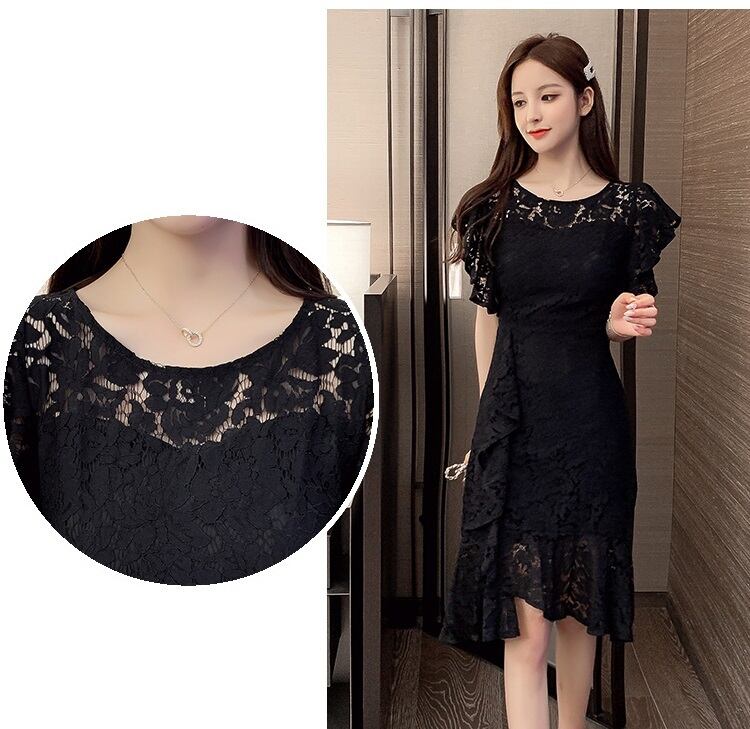 ミドルワンピース レディース ワンピース ワンピ ミドル丈 レース ラウンドネック タイト フレア きれいめ 上品 結婚式 パーティー 二次会 お呼ばれ 仕事 刺繍 黒 春 夏 デート お出かけ 10代 20代 女性 4XL 大人 コーデ コーディネート 韓国 ファッション オルチャン お取り寄せ 送料無料 hll-1066