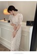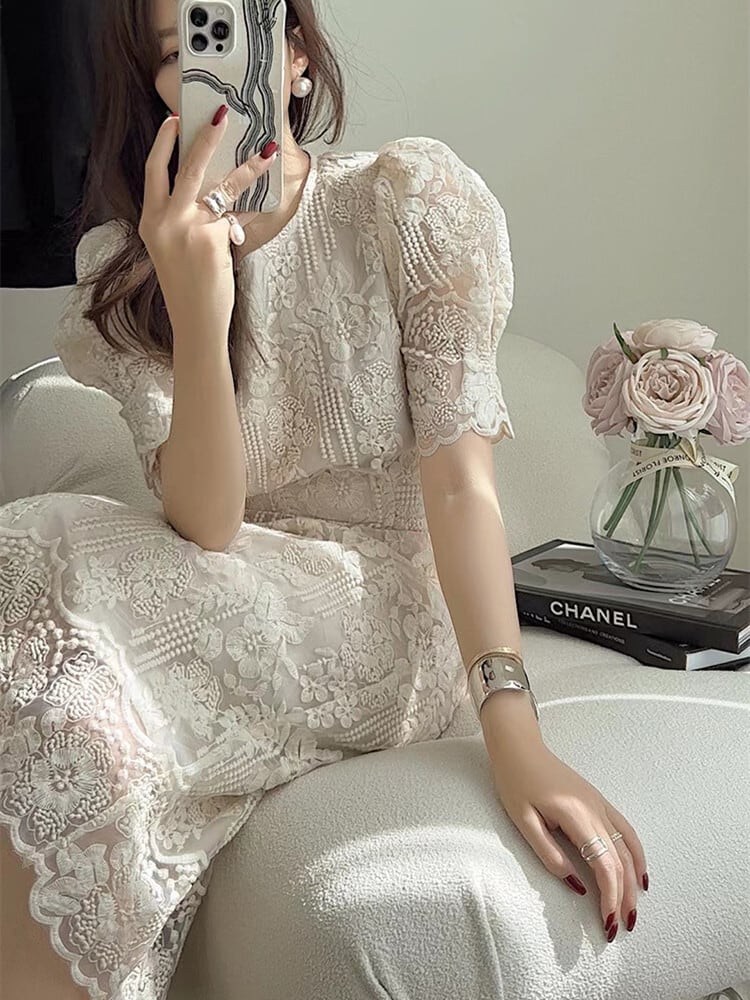 ロングワンピース レディース ワンピース ワンピ ロング 半袖 パフスリーブ ラウンドネック 刺繍 透け感 ウエストマーク 白 きれいめ 上品 結婚式 パーティー 二次会 デート お出かけ 春 夏 おしゃれ 20代 30代 女性 XL 大人 コーデ コーディネート 韓国 ファッション オルチャン お取り寄せ 送料無料 hll-1067