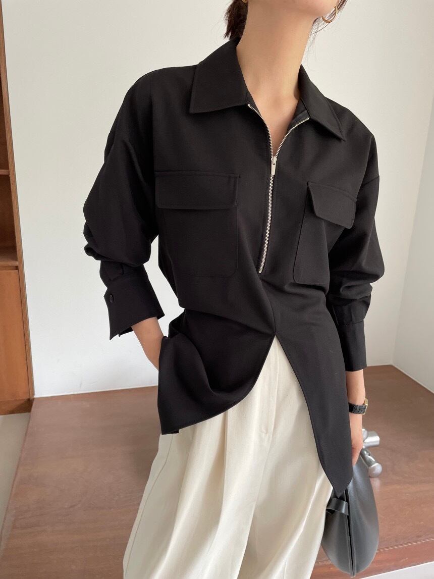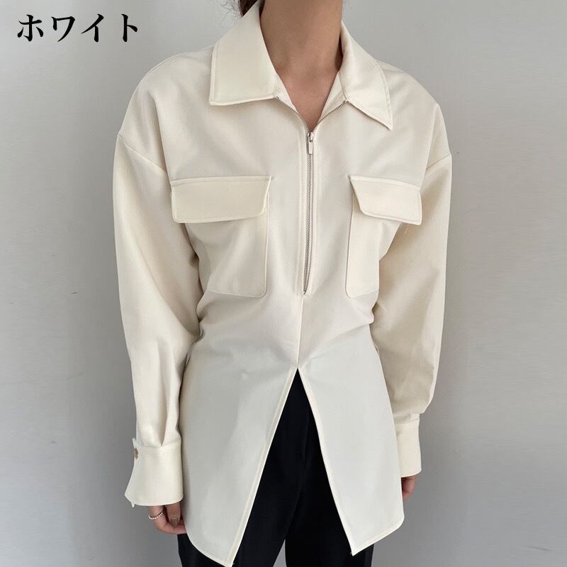 シャツ レディース トップス 長袖 襟付き ジッパー ファスナー バックタイ スリット ルーズ シック クール レトロ カジュアル きれいめ エレガント 上品 清楚 お洒落 普段使い 日常使い 普段着 お出かけ デート 女子会 休日 秋 ホワイト 白 ブラック 黒 ワンサイズ 20代 30代 大人 大人かっこいい コーデ コーディネート 韓国 ファッション オルチャン お取り寄せ 送料無料 hll-0953