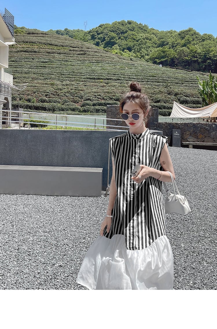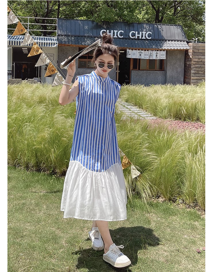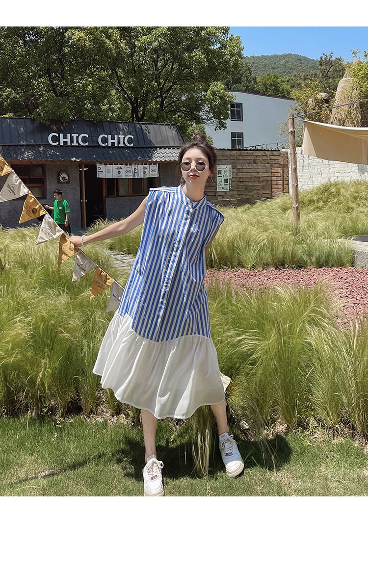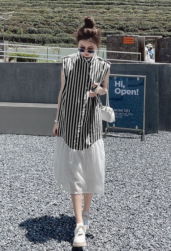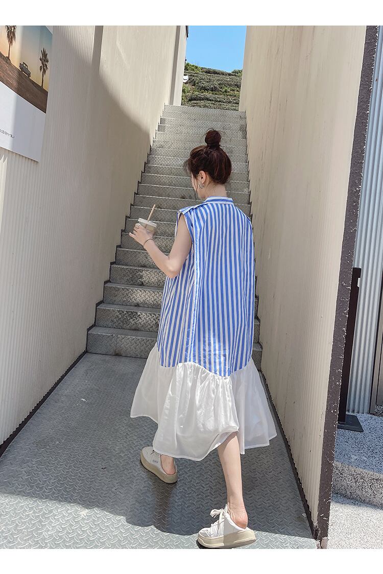 ロングワンピース レディース ロング ワンピース ワンピ ストライプ ノースリーブ ハイネック プルオーバー 切り替え デザイン ルーズ きれいめ フレア 薄手 黒 青 10代 20代 女性 デート お出かけ 女子会 XL 春 夏 大人 コーデ コーディネート 韓国 ファッション オルチャン お取り寄せ 送料無料 hll-1094