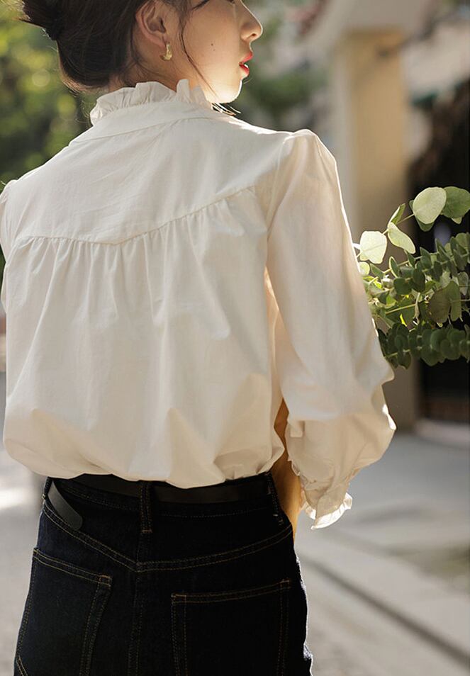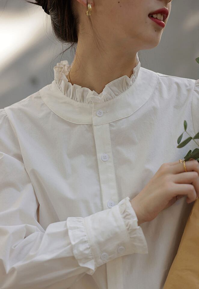 シャツ 長袖シャツ フリル トップス レディース 長袖 ラウンドネック ボタン 前開き 無地 スリム レトロ カジュアル きれいめ 可愛い お洒落 普段使い 日常使い 普段着 OL 通勤 オフィス お出かけ デート 女子会 休日 春 夏 ホワイト 白 S M L XL 2XL 3XL ラージサイズ 10代 20代 30代 大人 大人可愛い コーデ コーディネート 韓国 ファッション オルチャン お取り寄せ 送料無料 hll-1015