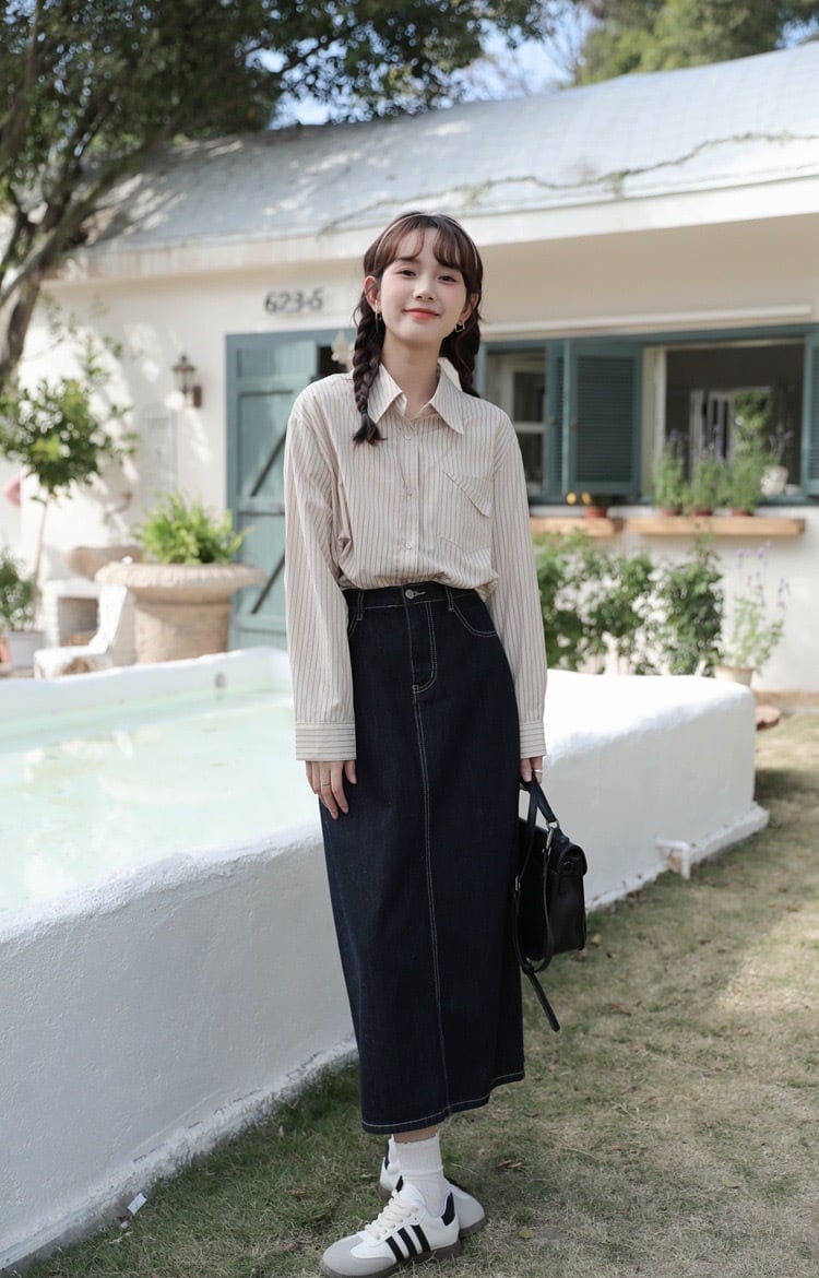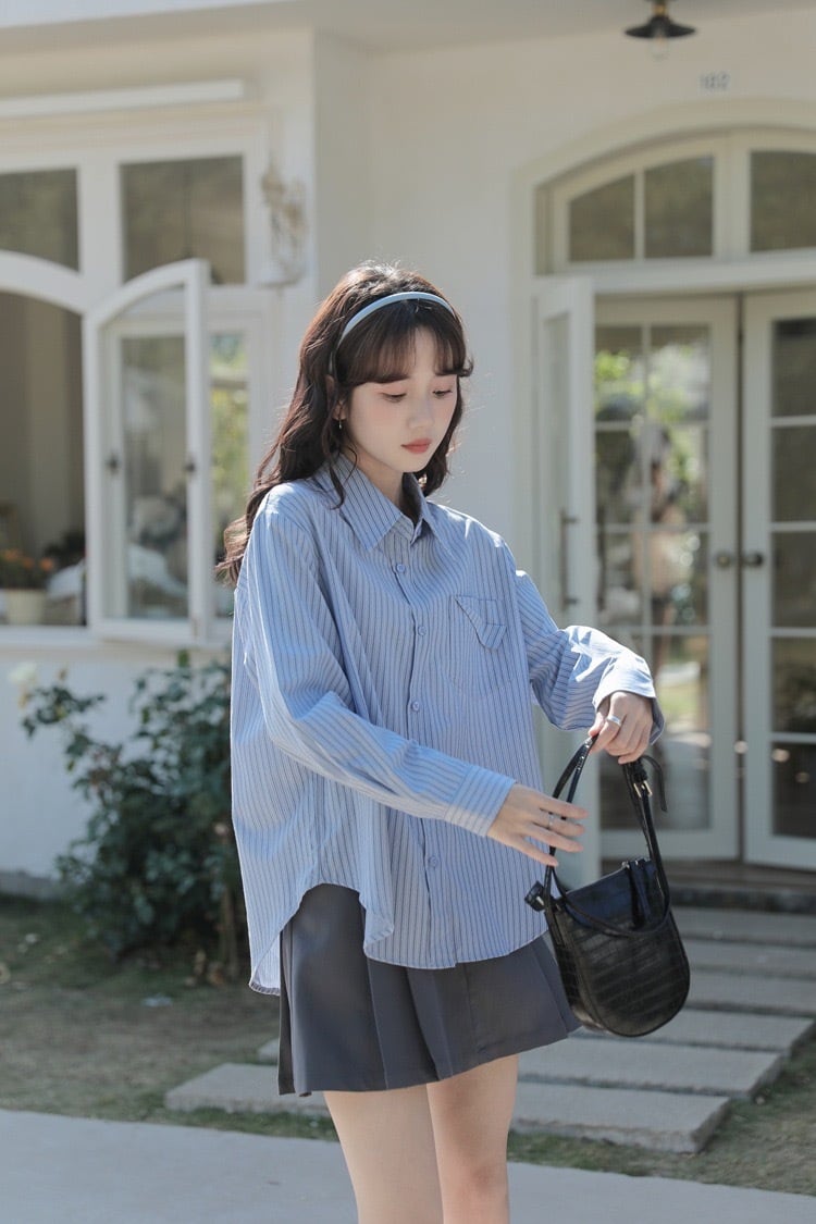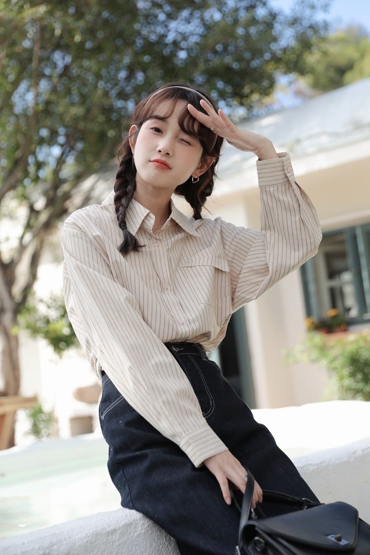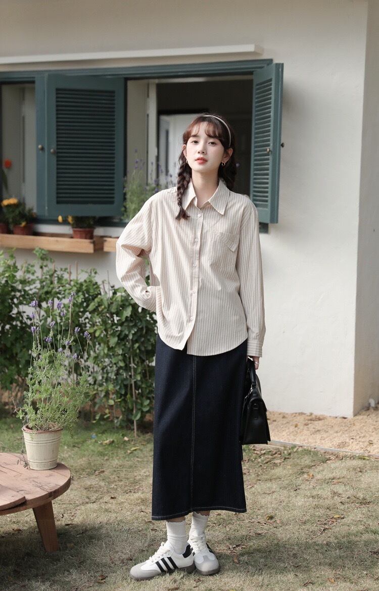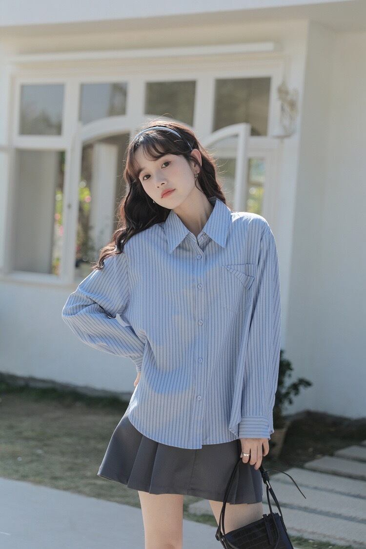 シャツ 長袖シャツ トップス レディース 長袖 襟付き ポロカラー ボタン 前開き ストライプ ルーズ クラシック レトロ カジュアル きれいめ 可愛い お洒落 普段使い 日常使い 普段着 お出かけ デート 女子会 休日 春 ブルー 青 アプリコット S M L 10代 20代 大人 大人可愛い コーデ コーディネート 韓国 ファッション オルチャン お取り寄せ 送料無料 hll-1188