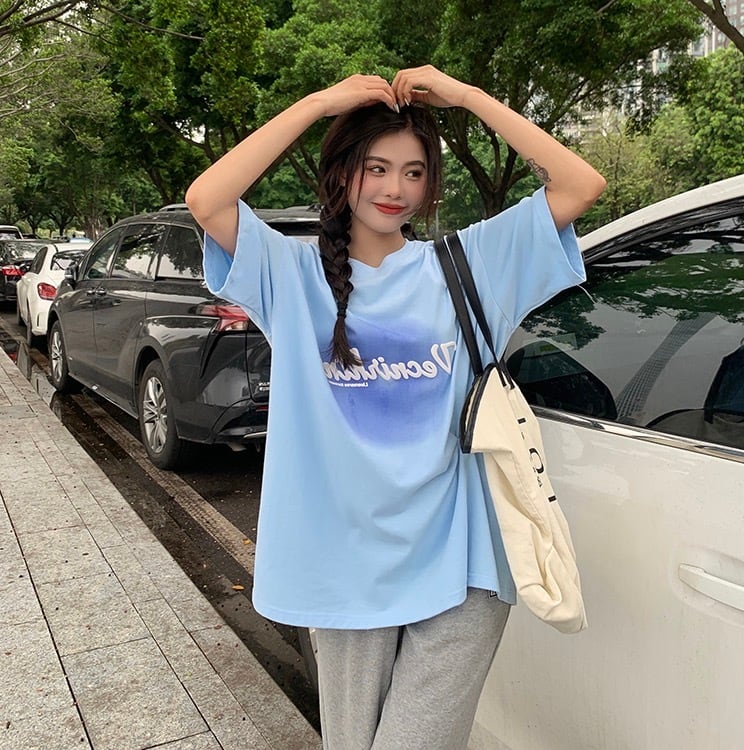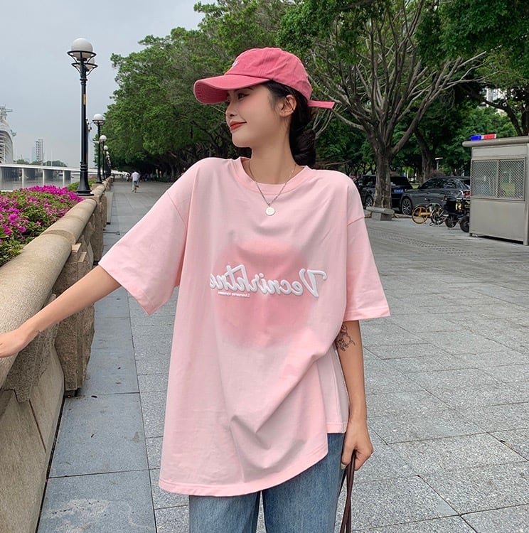 Tシャツ 半袖Tシャツ トップス レディース 半袖 ラウンドネック プルオーバー 文字 プリント ルーズ レトロ カジュアル きれいめ 可愛い お洒落 普段使い 日常使い 普段着 お出かけ デート 女子会 休日 夏 アプリコット ピンク ブルー 青 M L XL 10代 20代 30代 大人 大人可愛い コーデ コーディネート 韓国 ファッション オルチャン お取り寄せ 送料無料 hll-1218