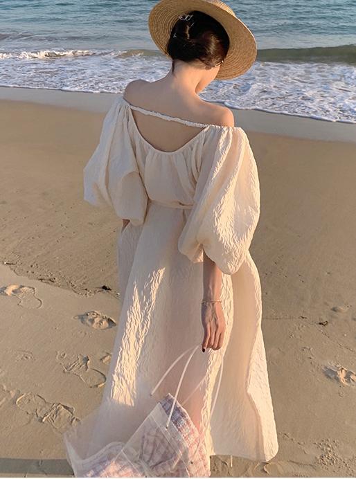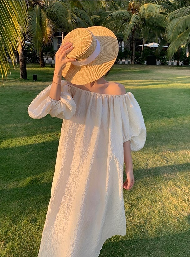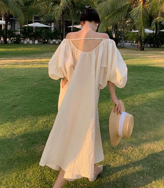ロングワンピース レディース ロング ワンピース ワンピ プルオーバー オフショルダー パフスリーブ 半袖 五分袖 デコルテ 背中見せ ルーズ ウエストベルト 白 きれいめ 上品 お出かけ 休日 デート 海 夏 ビーチ XL 大きいサイズ 大人 コーデ コーディネート 韓国 ファッション オルチャン お取り寄せ 送料無料 hll-1127