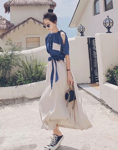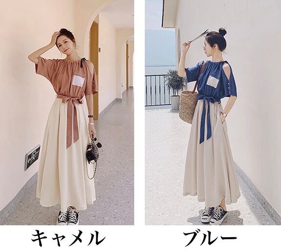ワンピース Aラインスカート ロング丈ワンピース ロングスカート ロング丈 レディース 半袖 ラウンドネック 切り替えデザイン リボン ハイウエスト スリム カジュアル フェミニン 大人女子 大人かっこいい お洒落 エレガント 夏 キャメル ブルー 青 S M L 10代 20代 30代 普段使い 日常使い 普段着 お出かけ 女子会 デート 休日 大人 コーデ コーディネート 韓国 ファッション オルチャン お取り寄せ 送料無料 hll-1307