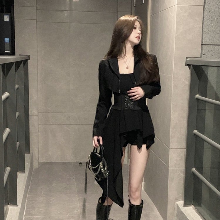 セットアップ 4点セット レディース パンツスーツ ジャケット チューブトップ ショートパンツ ショート丈 ベルト 4点セット 上下セット 長袖 ハイウエスト スリム 大人女子 大人かっこいい お洒落 クール エレガント 春 ブラック 黒 S M 10代 20代 お出かけ 女子会 デート イベント お呼ばれ 大人 コーデ コーディネート 韓国 ファッション オルチャン お取り寄せ 送料無料 hll-1321