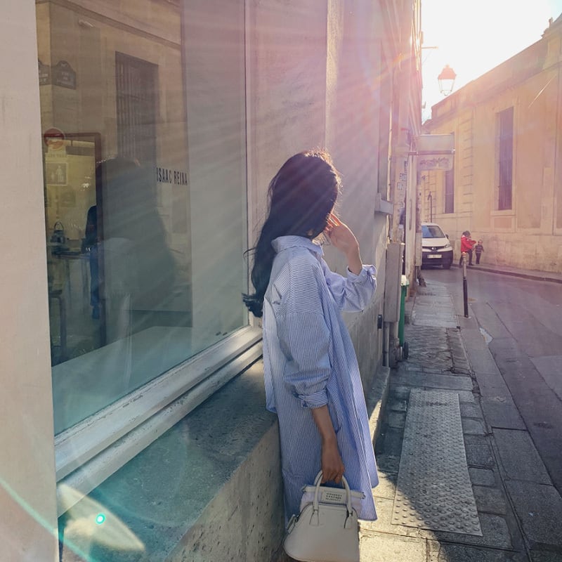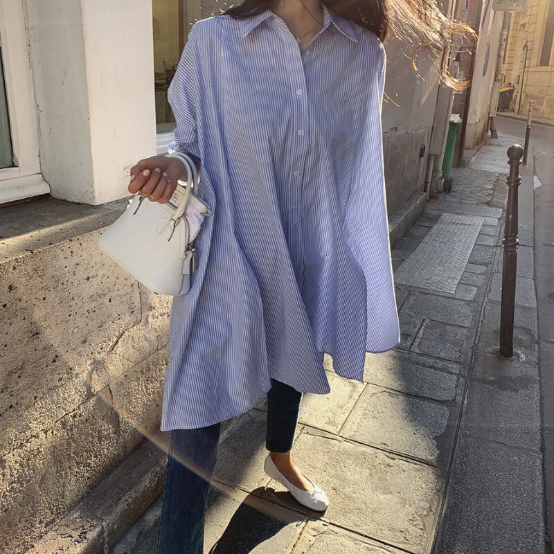シャツ ロングシャツ 長袖シャツ ストライプシャツ ストライプ レディース トップス 長袖 襟付き ポロカラー ボタン 前開き オーバーサイズ ルーズ ゆったり レトロ カジュアル きれいめ 上品 清楚 お洒落 日焼け止め 普段使い 普段着 日常使い お出かけ デート 女子会 休日 春 ブルー 青 S M L XL 10代 20代 30代 大人かっこいい コーデ コーディネート 韓国 ファッション オルチャン お取り寄せ 送料無料 hll-1334