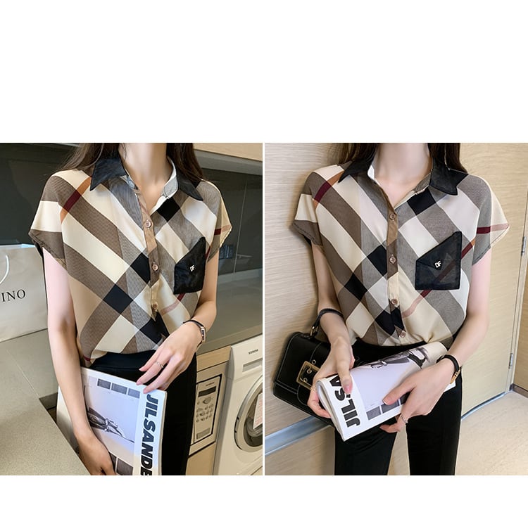 チェックシャツ レディース トップス 半袖 シャツ チェック 襟付き 前開き ボタン レギュラー丈 薄手 春 夏 きれいめ 上品 オフィス 仕事 20代 30代 女性 ママ デート お出かけ 女子会 2XL 大人 コーデ コーディネート 韓国 ファッション オルチャン お取り寄せ 送料無料 hll-1380