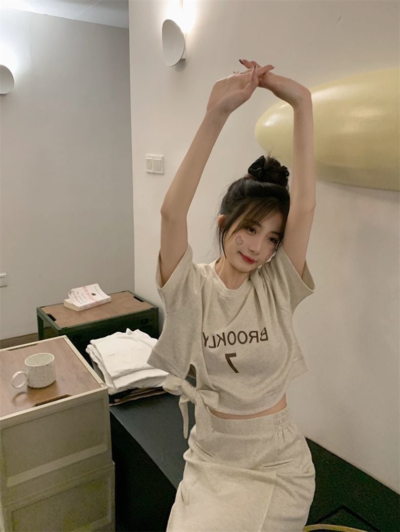 セットアップ レディース 2点セット 半袖 スウェット クロップド丈 リボン ラウンドネック プルオーバー ロゴ ロング スカート ウエストゴム Aライン カジュアル シンプル デイリー ルームウェア デート お出かけ 女子会 2XL 春 夏 大人 コーデ コーディネート 韓国 ファッション オルチャン お取り寄せ 送料無料 hll-1391