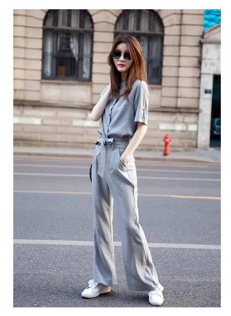 五分袖セットアップ 2点セット レディース 五分袖 前開き ストライプ ウエストベルト ワイドパンツ きれいめ オシャレ 可愛い デート お出かけ 女子会 20代 30代 女性 ママ 2XL 春 夏 大きい 大人 コーデ コーディネート 韓国 ファッション オルチャン お取り寄せ 送料無料 hll-1398