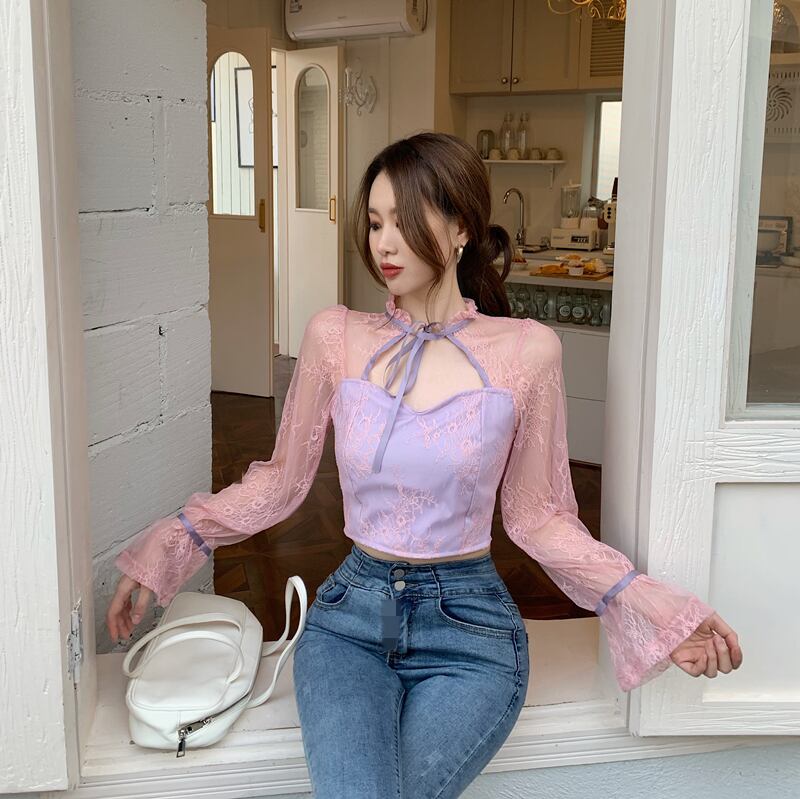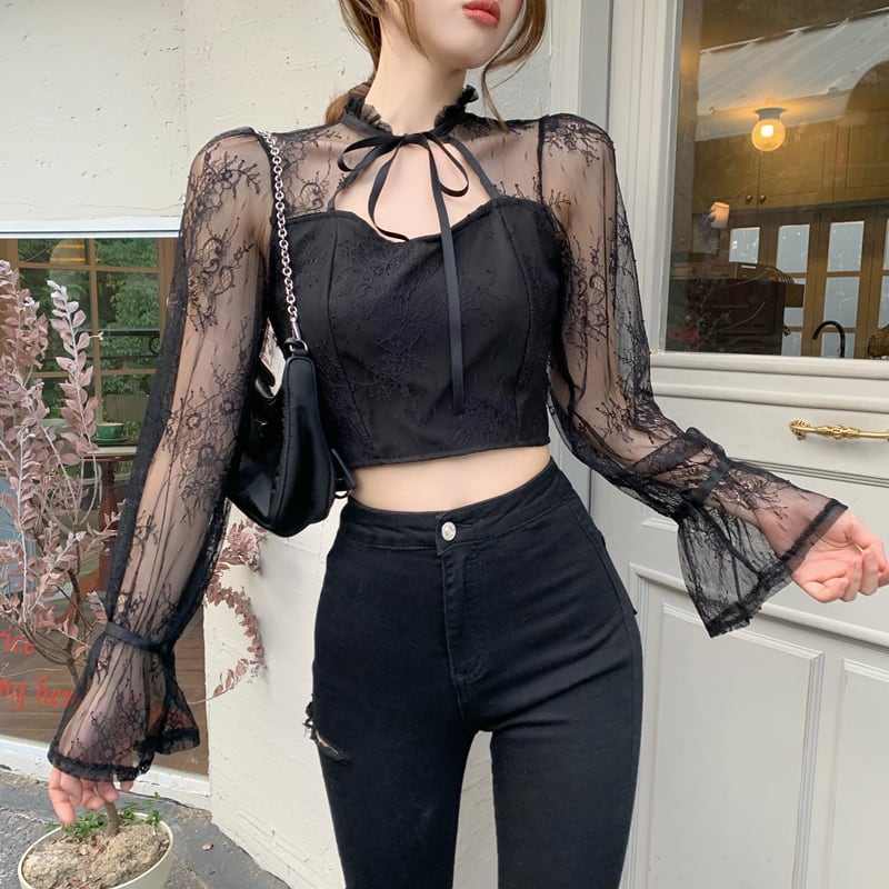 長袖メッシュシャツ レディース 長袖 シャツ クロップド丈 シアー 透け感 メッシュ 刺繍 レース セクシー リボン チョーカー風 かわいい 可愛い 日常 デート お出かけ 普段着 10代 20代 女性 黒 春 夏 大人 コーデ コーディネート 韓国 ファッション オルチャン お取り寄せ 送料無料 hll-1440