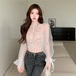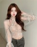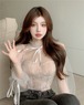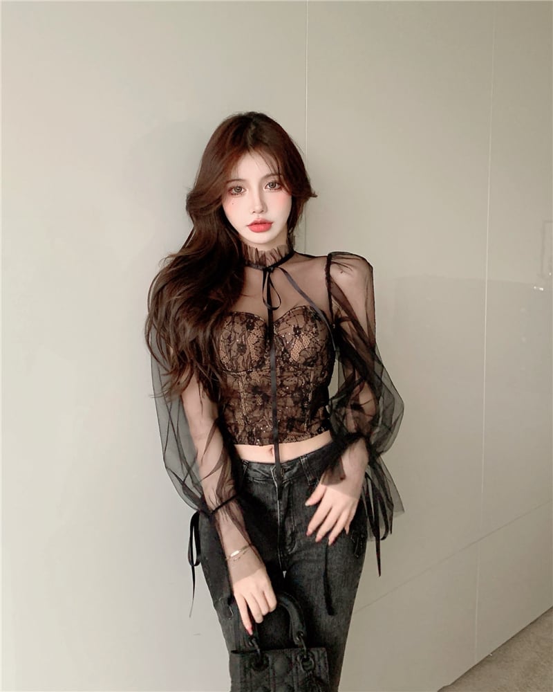 刺繍シアーシャツ レディース 長袖 シャツ クロップド丈 コルセット風 刺繡 透け感 シアー チョーカー風 リボン セクシー タイト 白 黒 デート お出かけ 女子会 春 夏10代 20代 女性 大人 コーデ コーディネート 韓国 ファッション オルチャン お取り寄せ 送料無料 hll-1436
