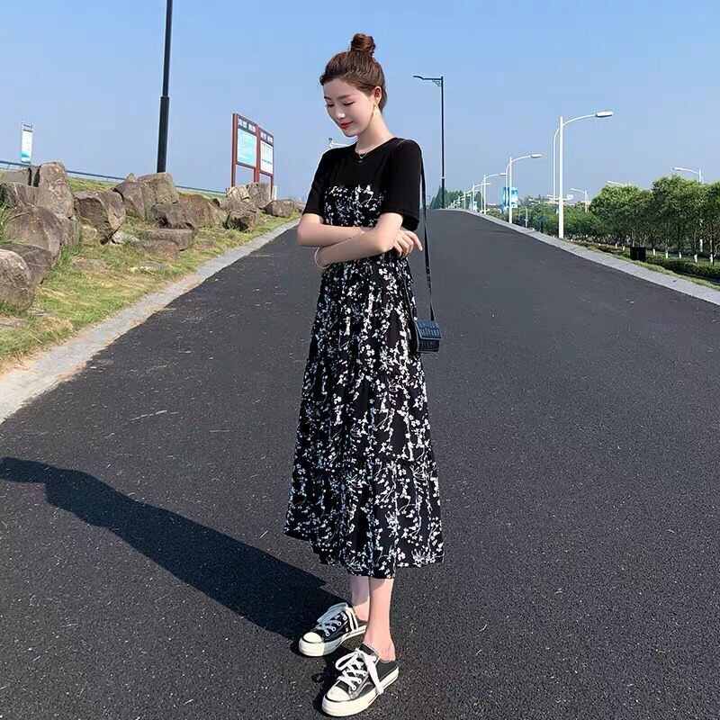 半袖ロングワンピース レディース 半袖 ワンピース ワンピ ロング レイヤード風 ボタニカル 黒 ラウンドネック かわいい 可愛い日常 デート お出かけ リゾート 普段着 10代 20代 30代 女性 ママ 体形カバー 3XL 4XL 大きい 春 夏 大人 コーデ コーディネート 韓国 ファッション オルチャン お取り寄せ 送料無料 hll-1424